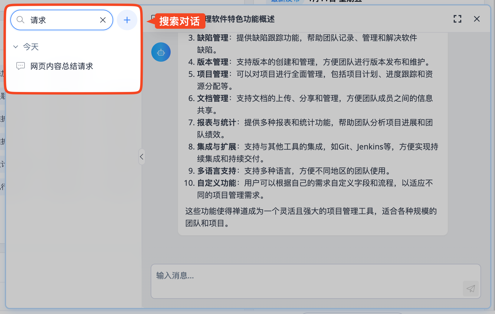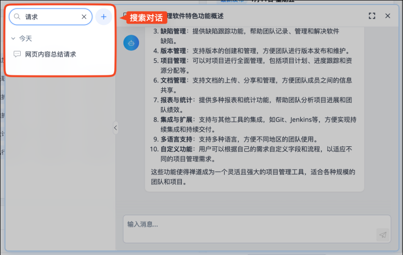禅道 AI 插件提供“总结”功能。操作方式与“翻译”相同:选中需要总结的内容后,点击全局 AI 按钮上方的“总结”快捷按钮,即可在页面右上方弹出面板查看总结结果。