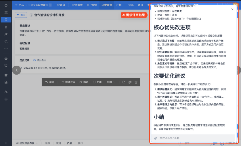 目前,AI 需求评审会给出结果总结、核心优先改进项和次要优化建议。修改需求后,可再次调用以获取新的评审建议。我们将在后续版本中进一步增强该功能,提供更强的交互式评审能力。