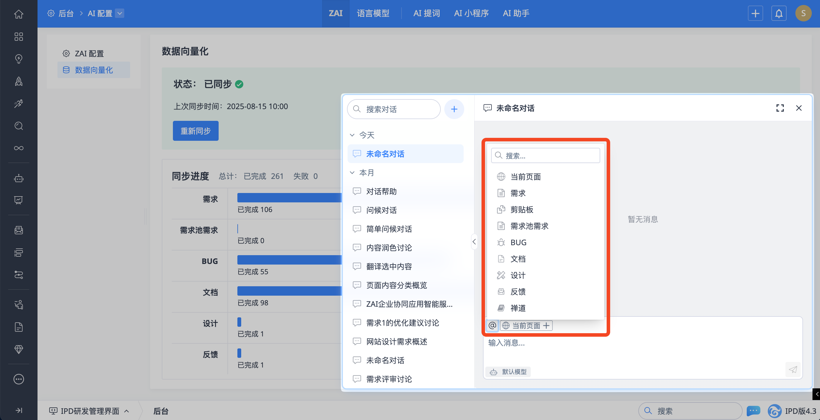 在进行 AI 对话时,支持将外部数据快捷地添加到对话中。这些数据可能来自当前界面,也可能来自向量化数据,例如当前页面内容、禅道文档等。