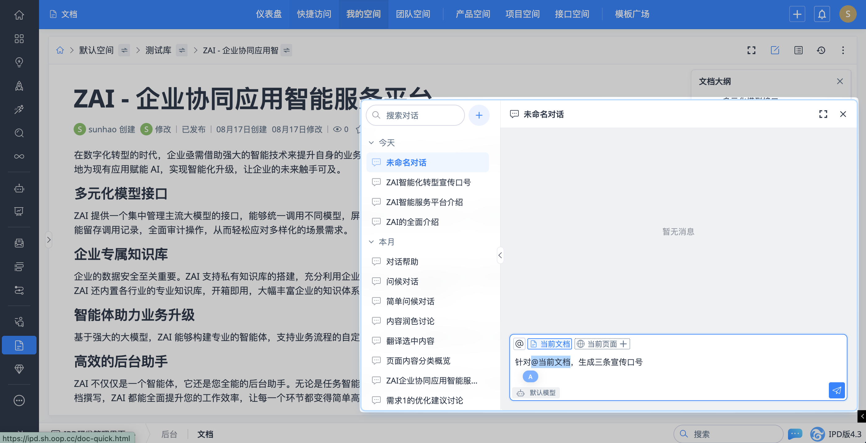 部分上下文类型需要在特定页面才能使用。例如,@当前文档 需要先打开具体的禅道文档页面。