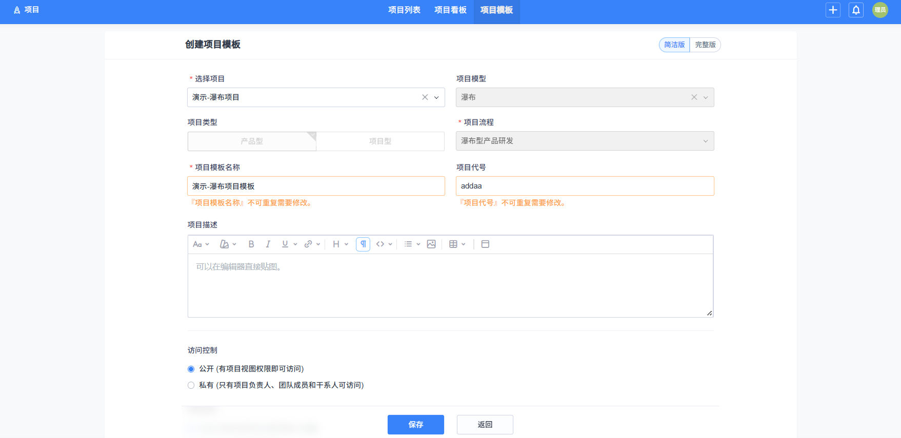 项目模板名称与项目代号不可与已有的项目和项目模板重复。