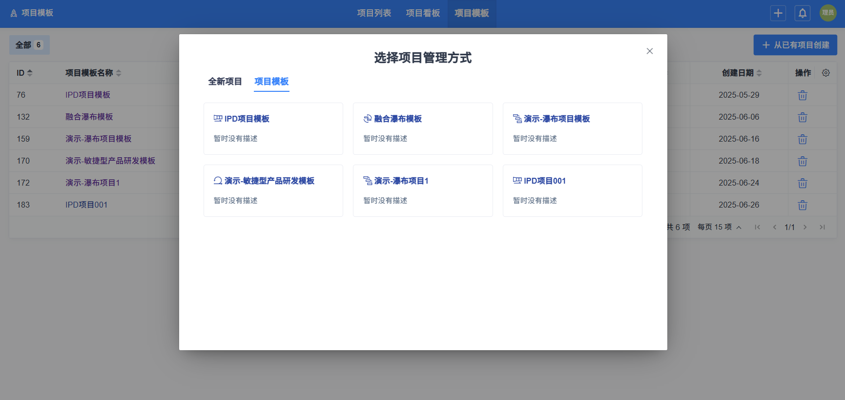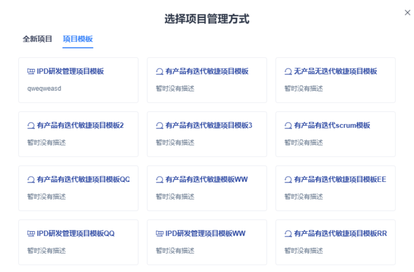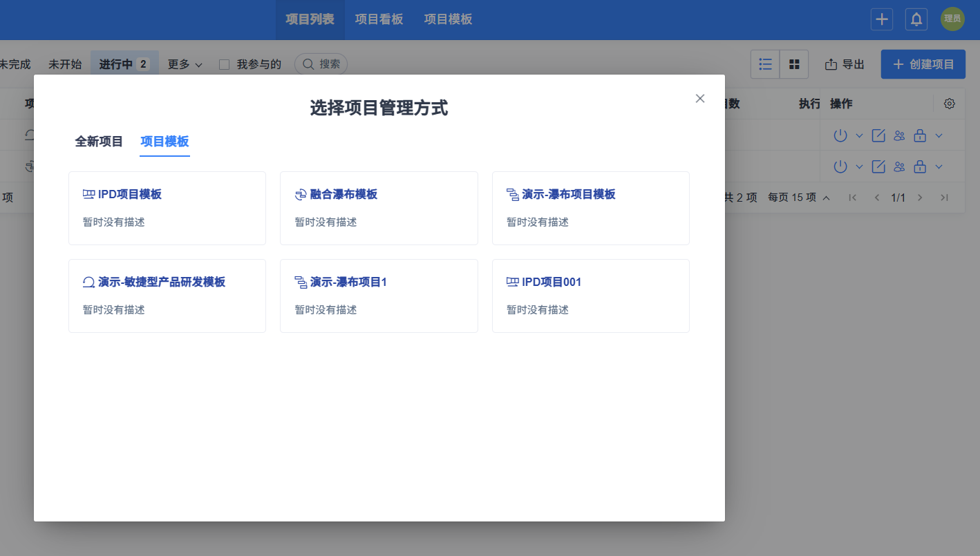 点击创建项目,弹出弹窗,会展示当前用户有权限的使用中的项目模板,点击要使用的模板,会自动带入模板信息,完善信息后,即可创建项目。