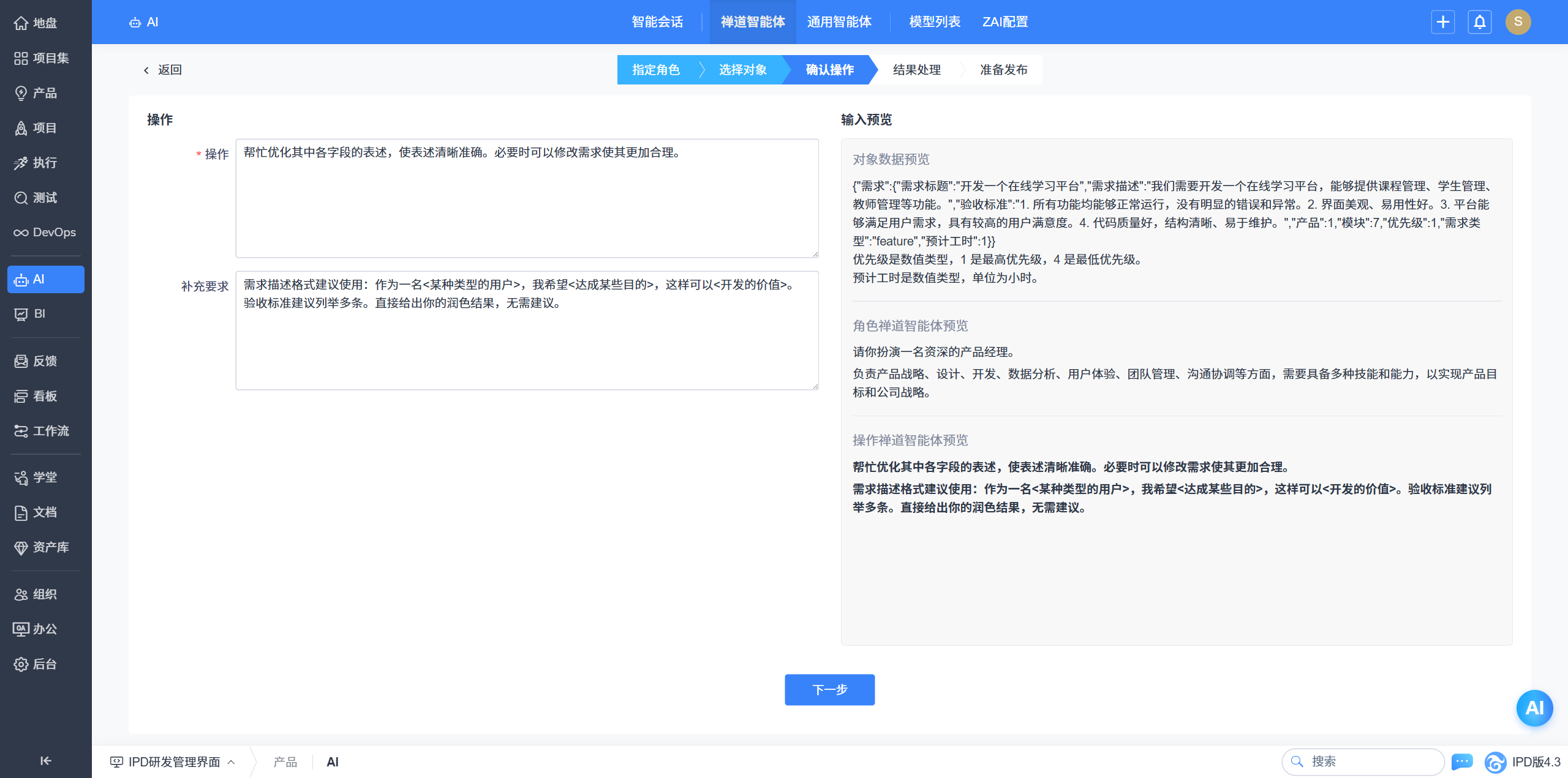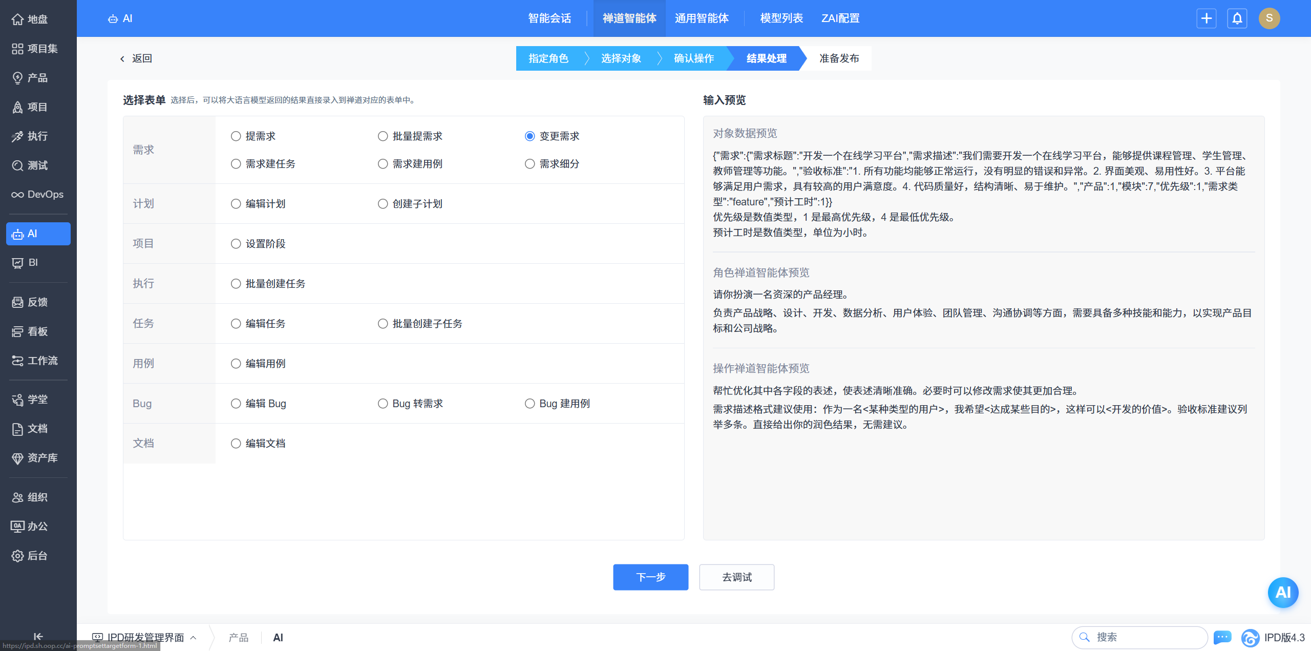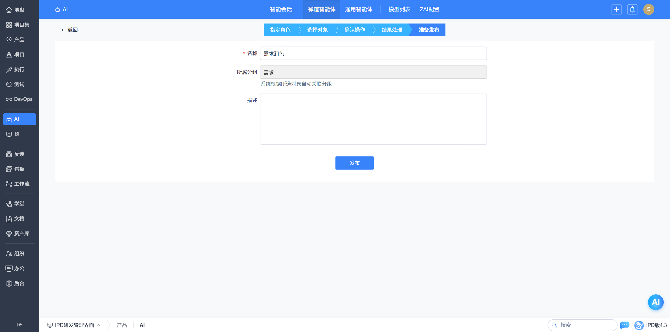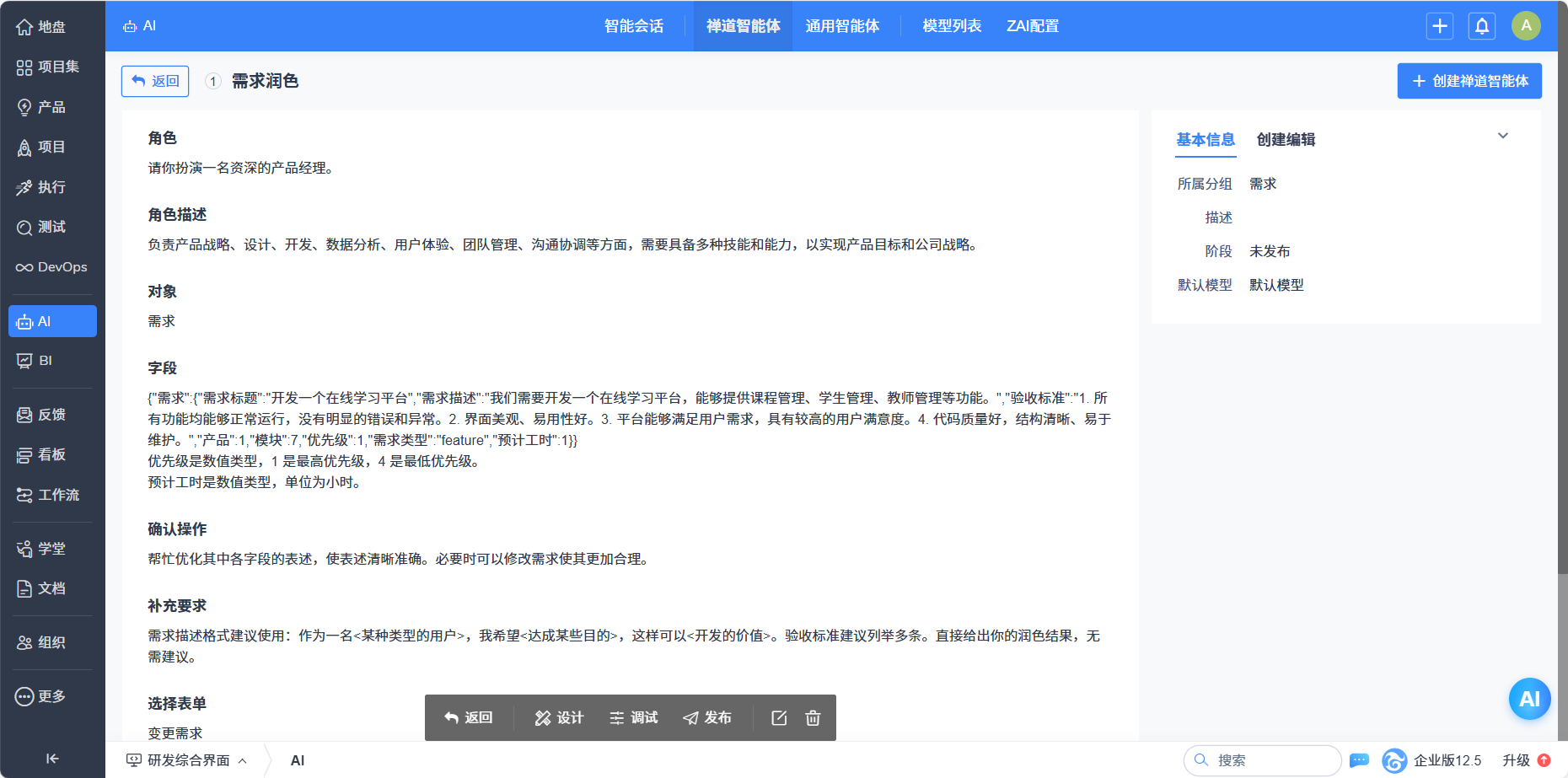 - 以流程引导的方式引导用户设计出高质量禅道智能体。