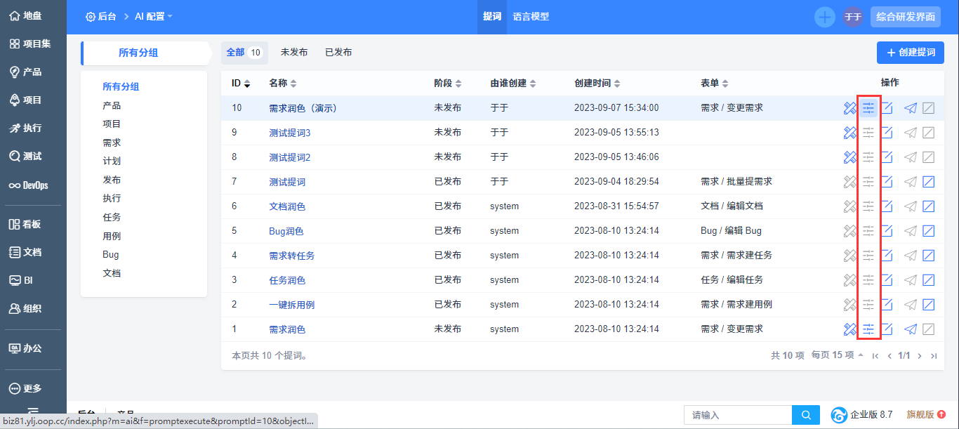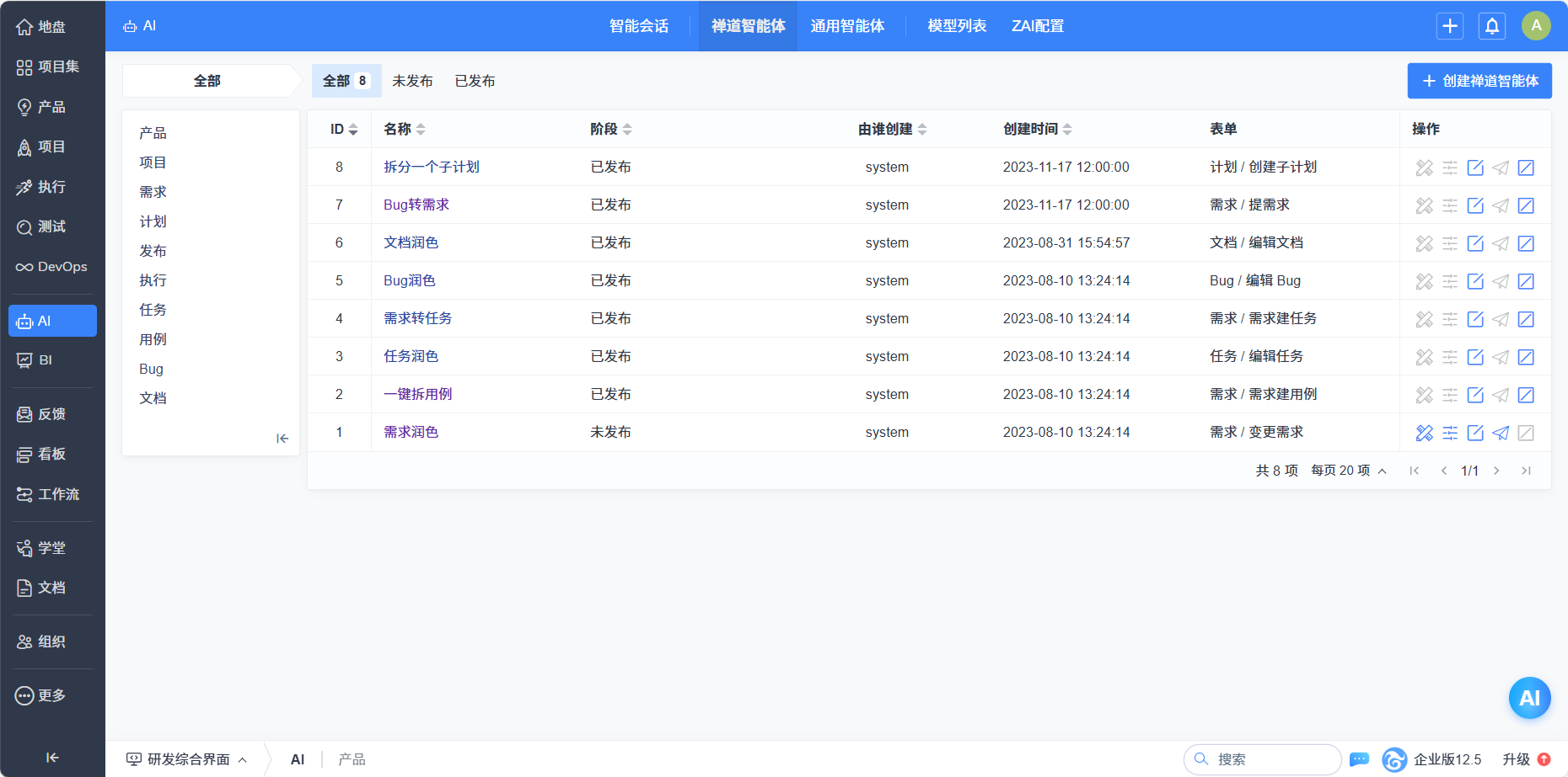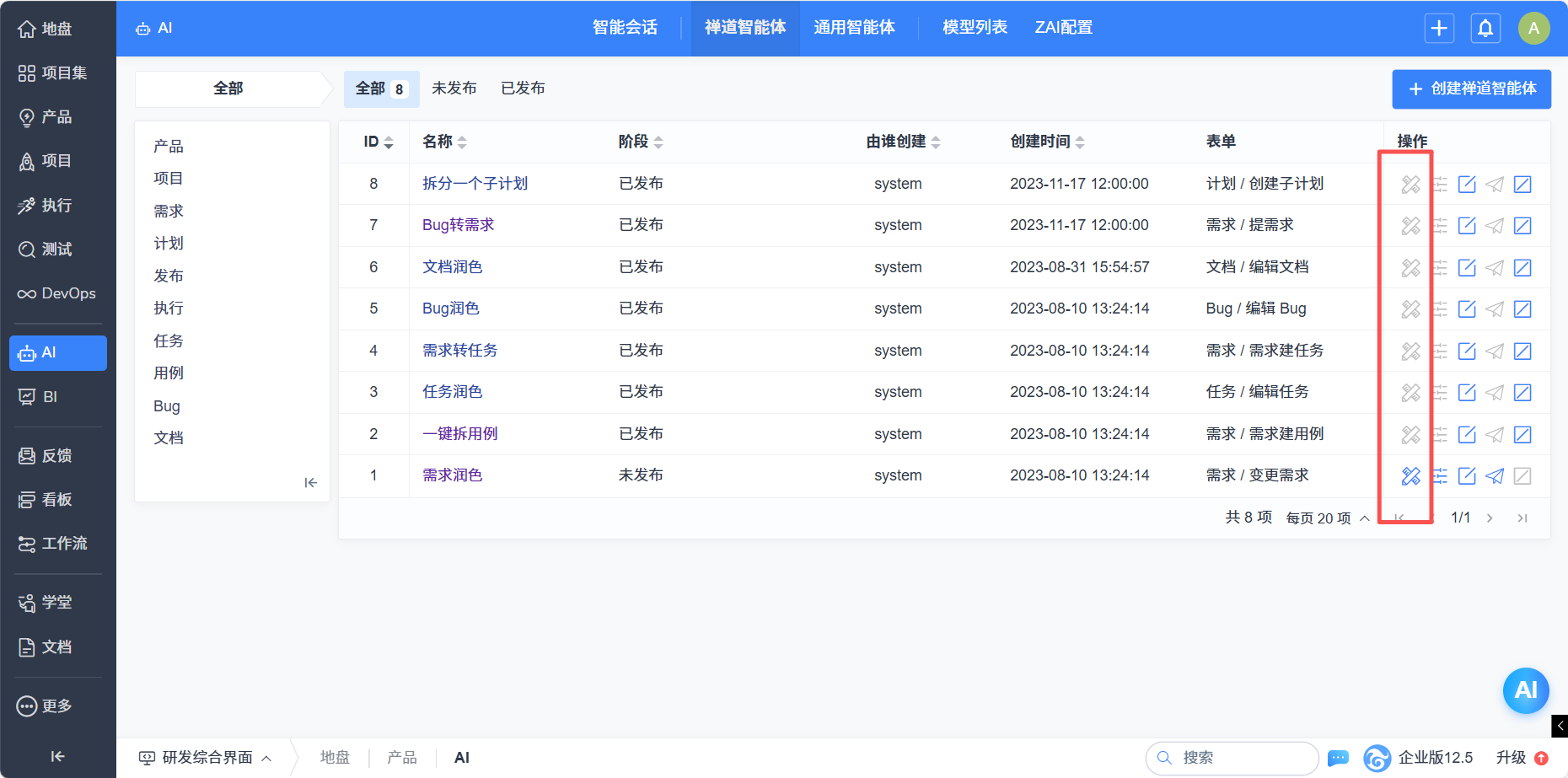 在禅道智能体列表页,进行增删改查等操作。