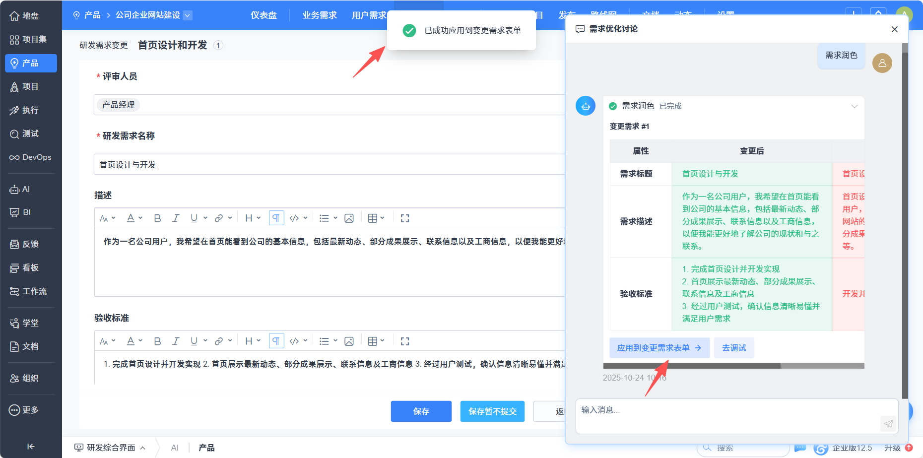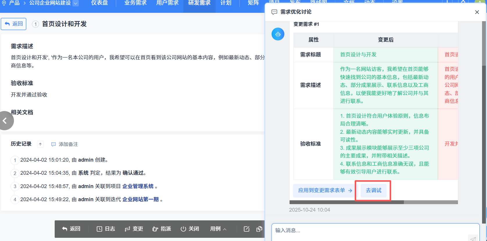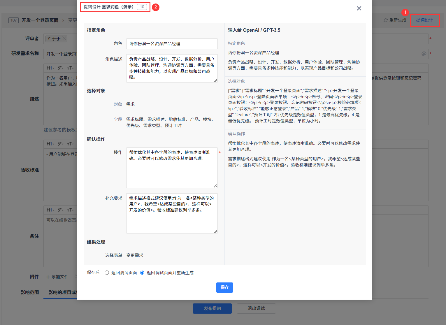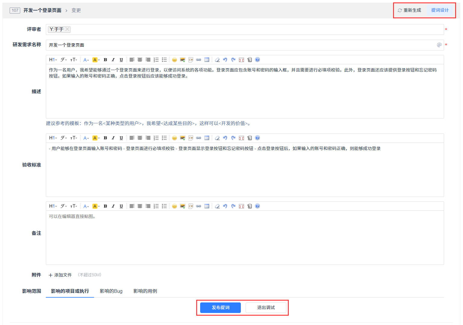 在设计器结果处理表单、智能体列表操作栏和提词对象页中,点击去调试按钮,可以对未发布的智能体进行调试,调试后可重新生成结果,返回结果令用户满意后即可发布智能体。