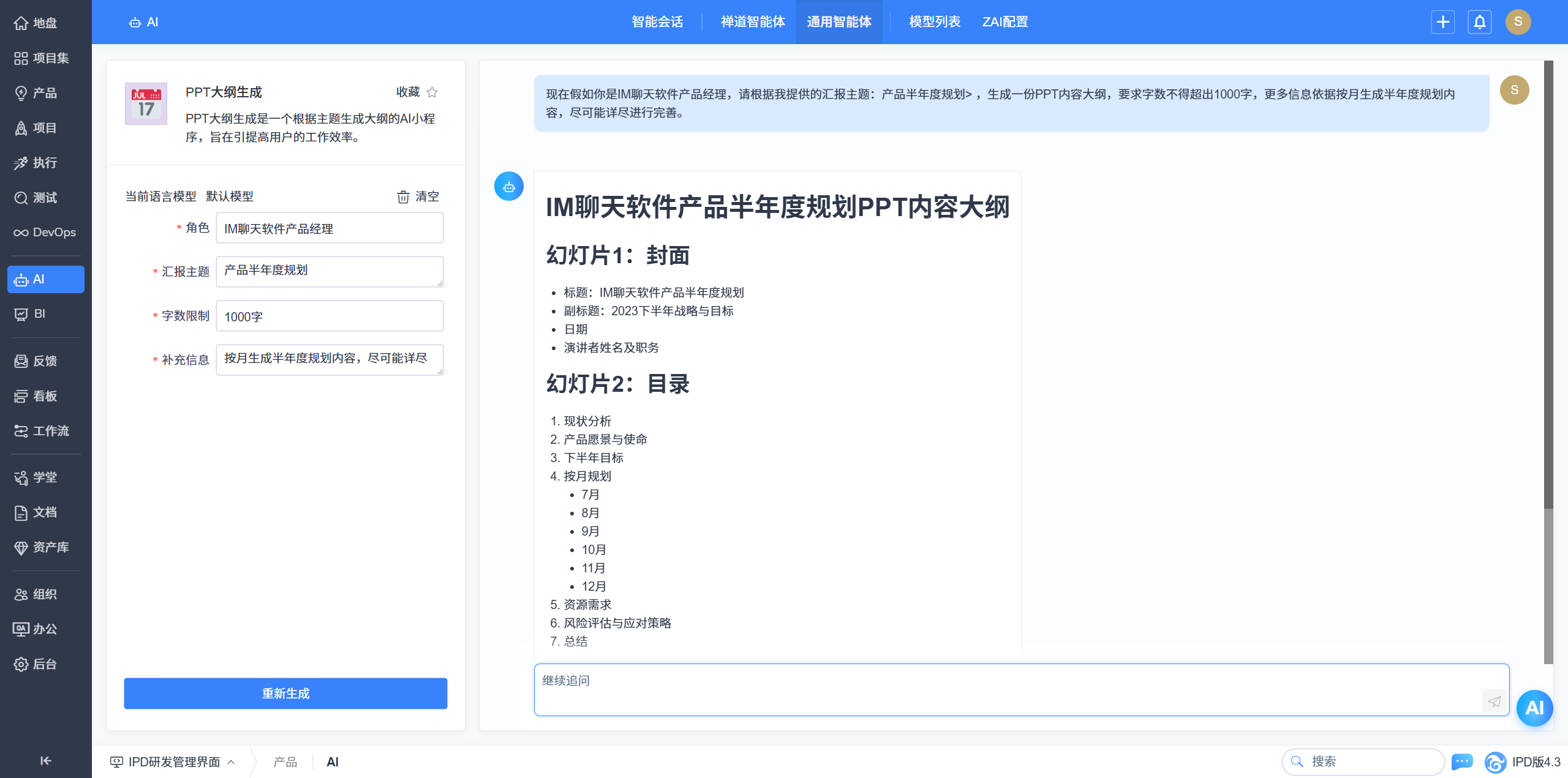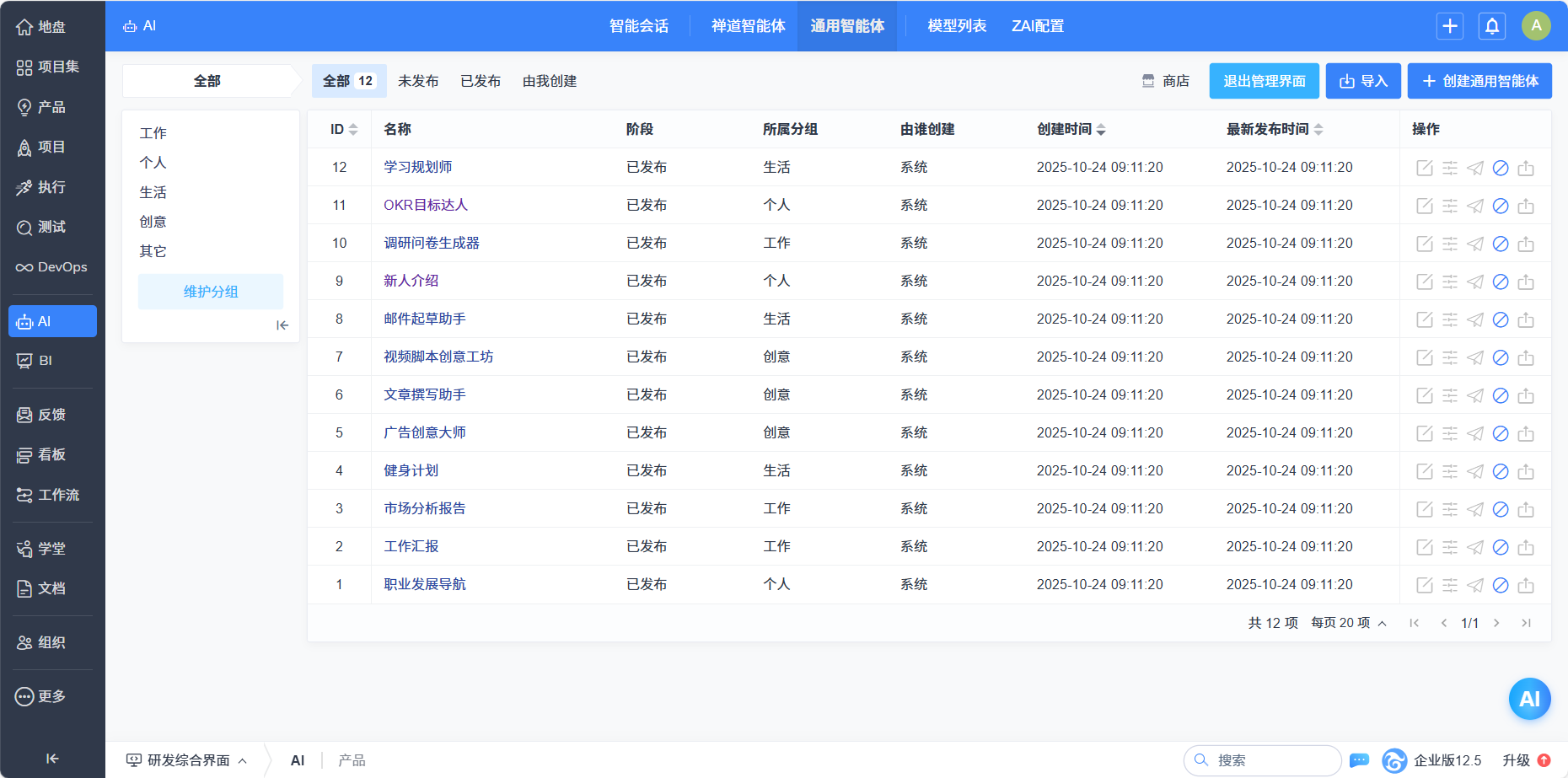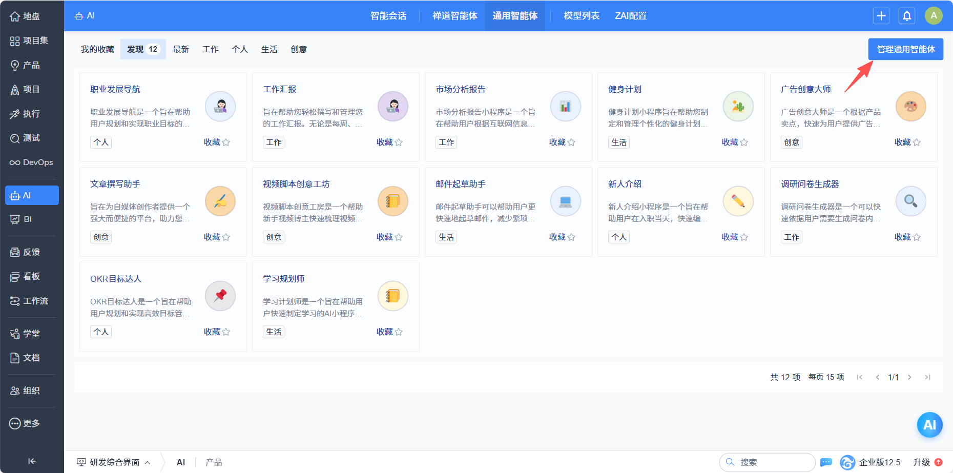 点击管理通用智能体进入通用智能体管理页面,点击创建通用智能体,进入智能体设计器。