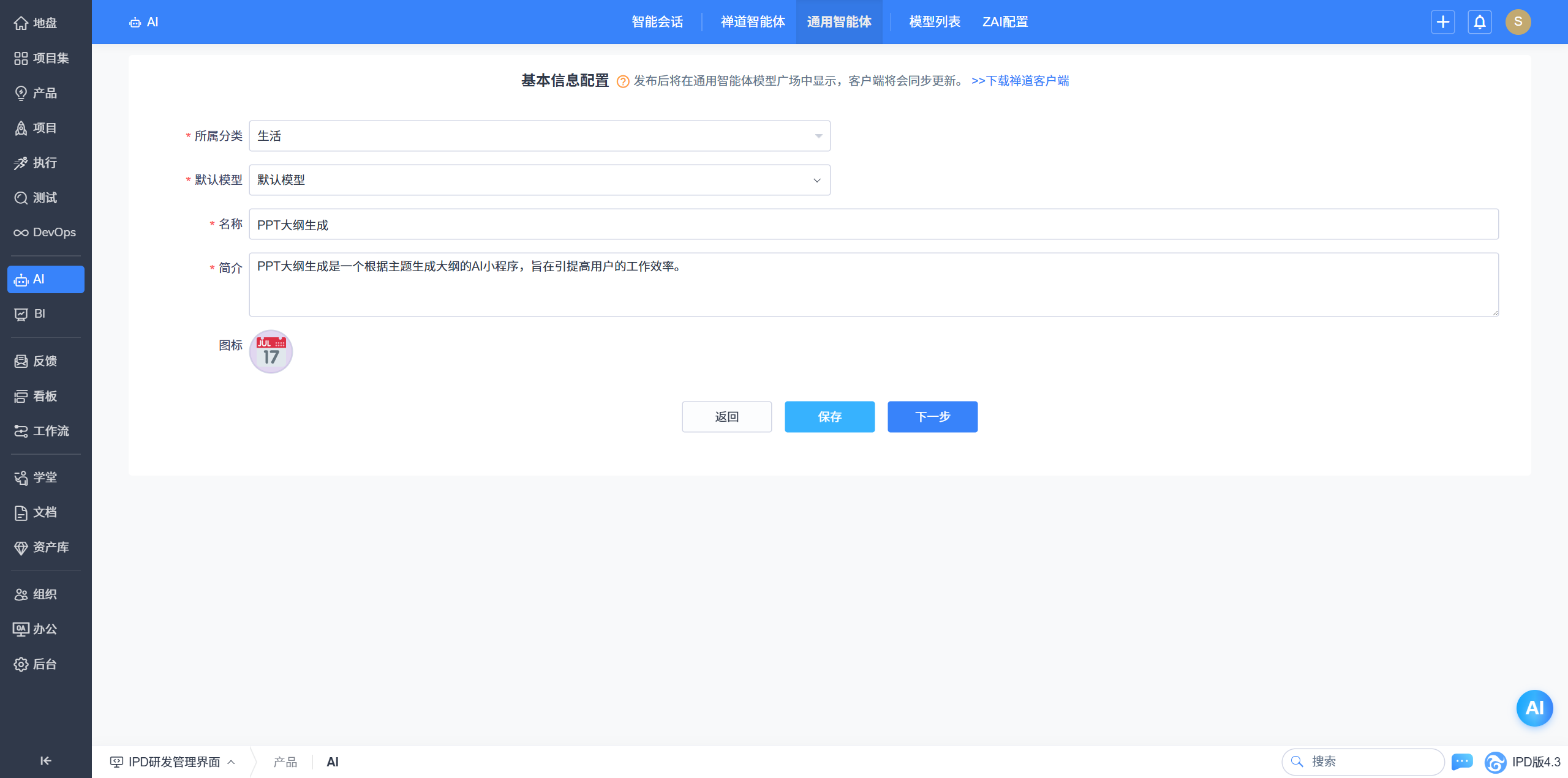 新增通用智能体分两个步骤,分别为配置智能体基本信息和配置表单、提词等信息。第一步配置通用智能体基础信息包括分类、应用的语言模型、名称、简介、图标内容。