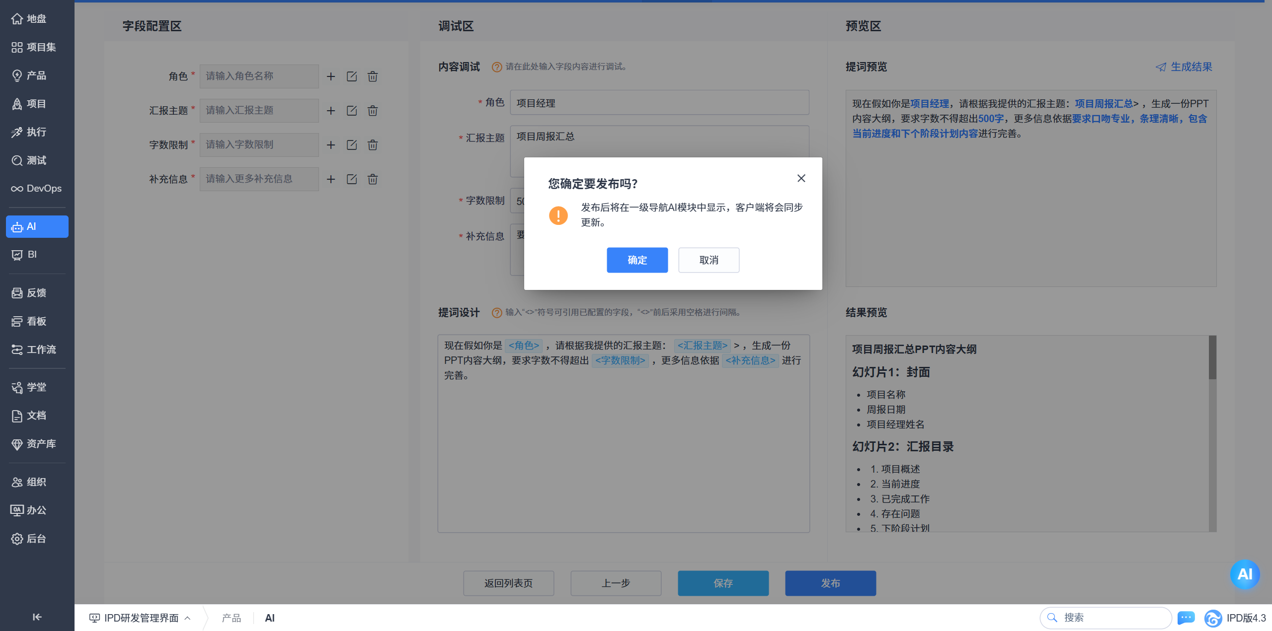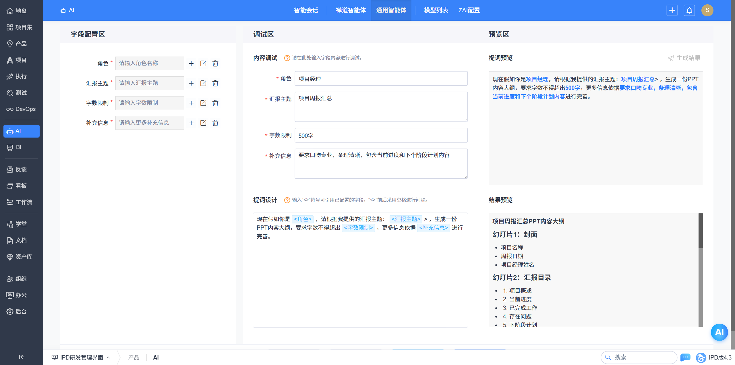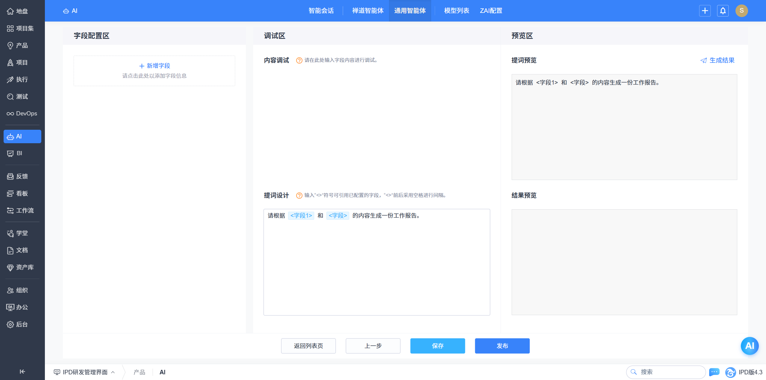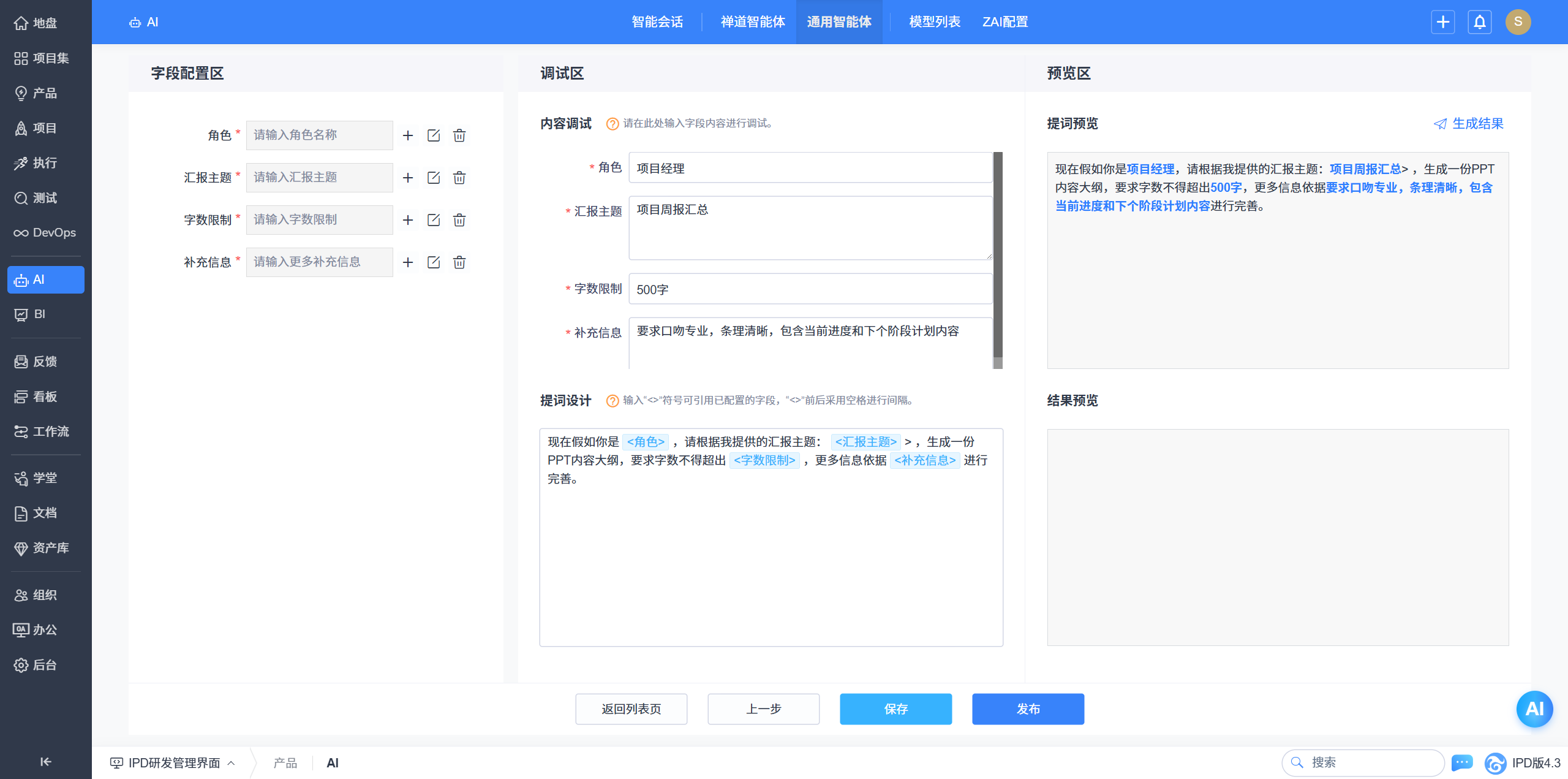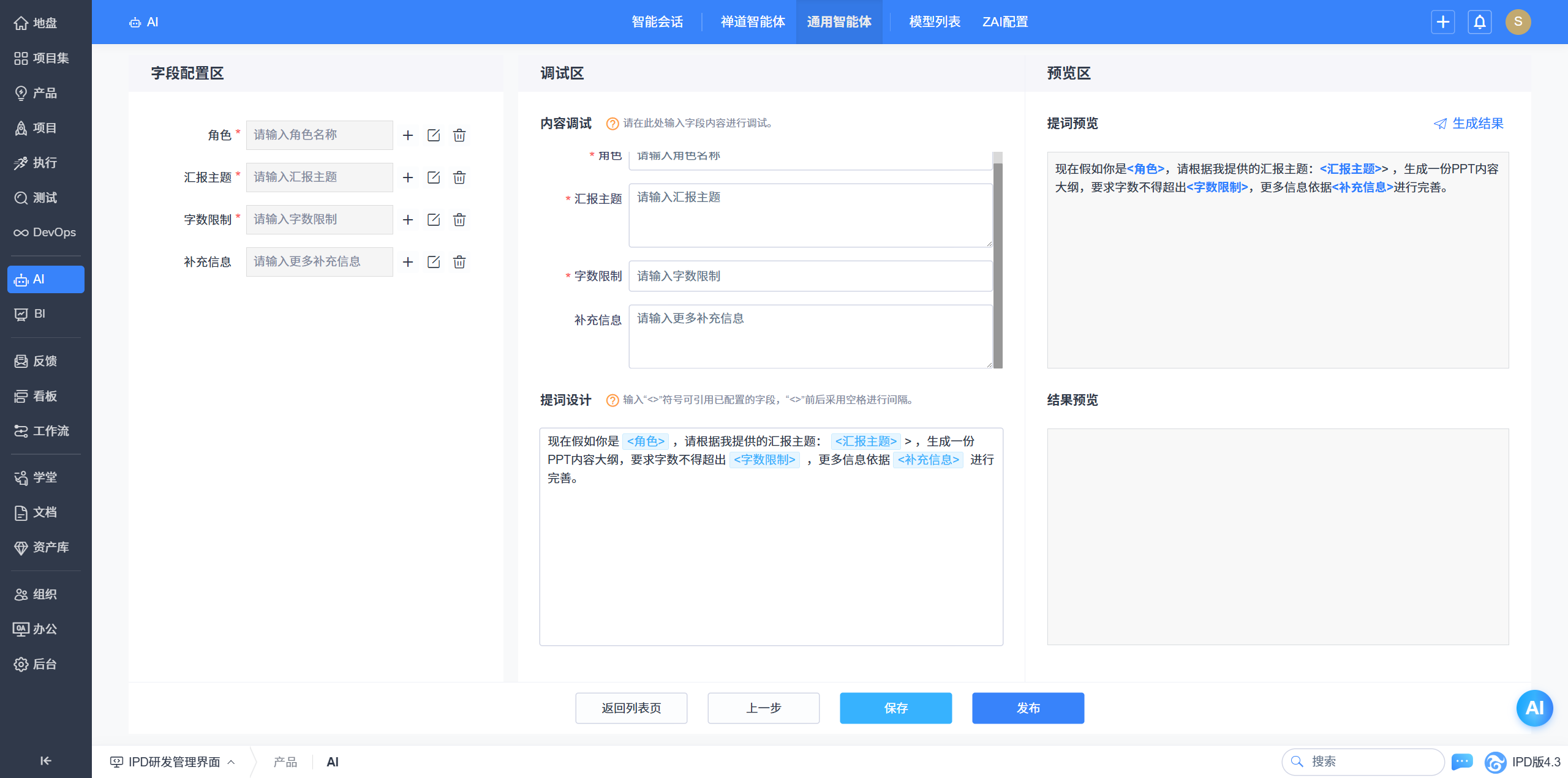第二步配置通用智能体表单和提词信息,包括字段配置、提词模板、调试内容、提词预览、结果预览,保存后即可完成AI小程序设计。