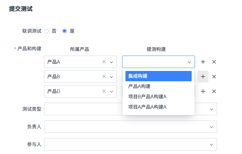 测试模块点击【提交测试】按钮,进入提交测试单页面。联调测试选择‘’是‘’,表单中支持选择多个产品和版本。保存后,系统会针对多个版本自动创建测试单。