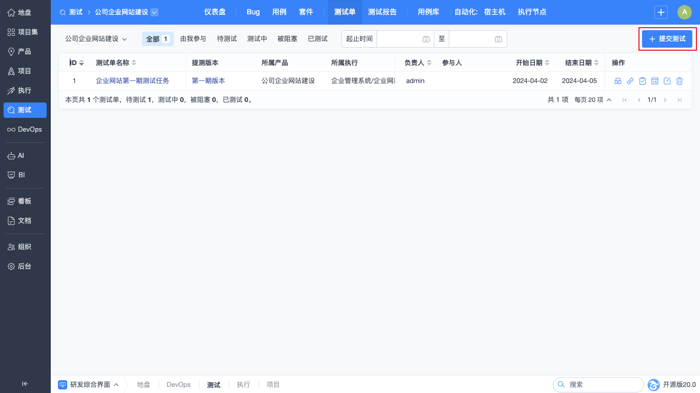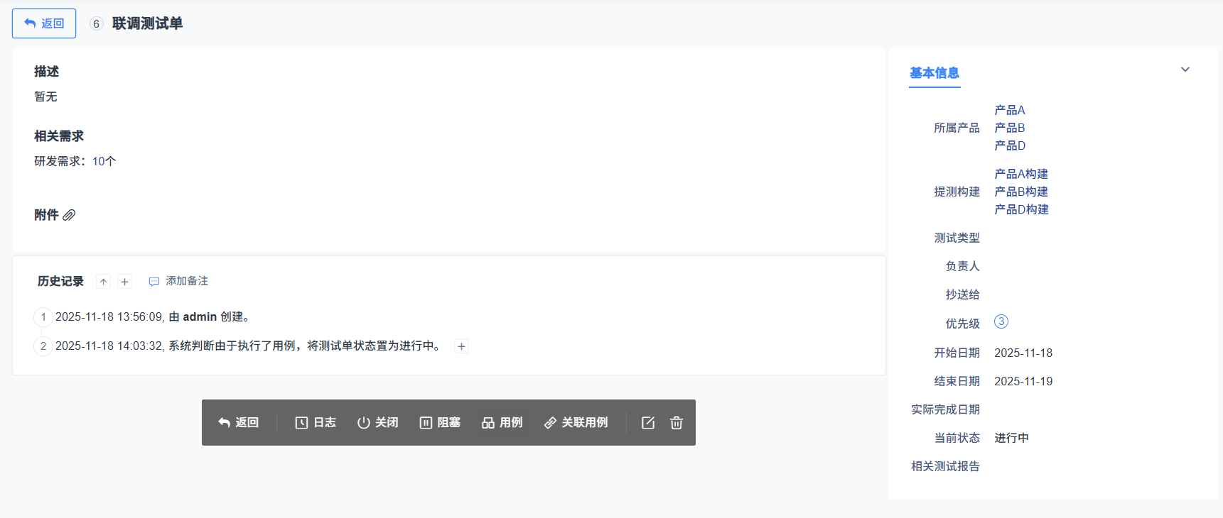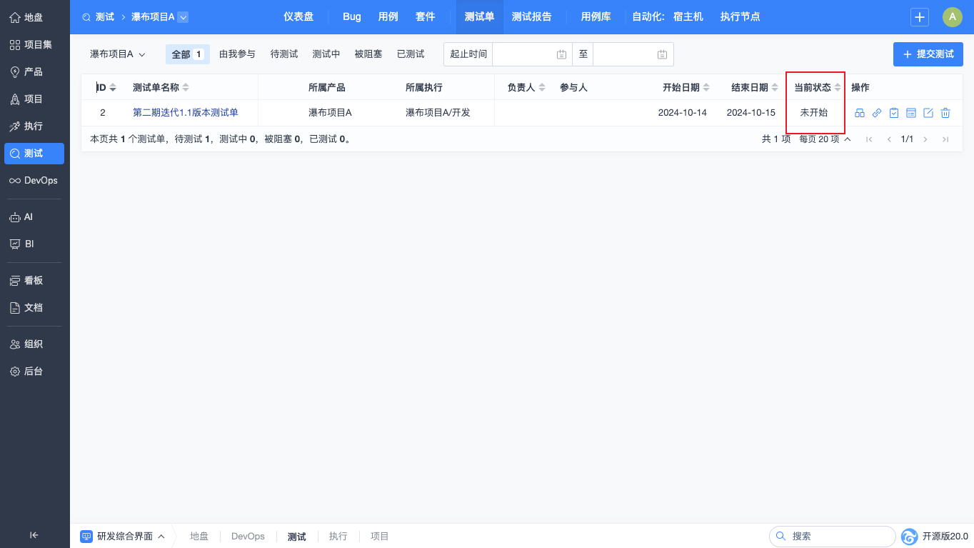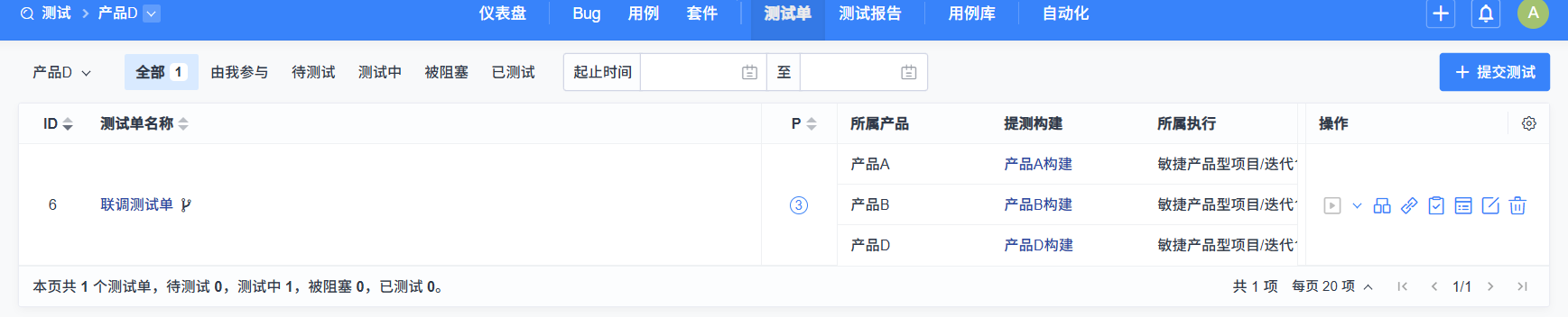 测试单列表中会展示联调测试单,您可以看到该测试单对应的产品、版本和执行。