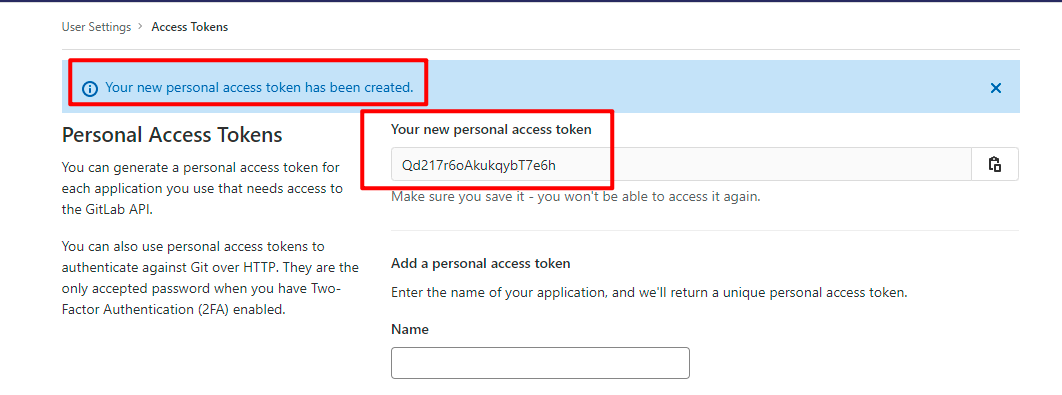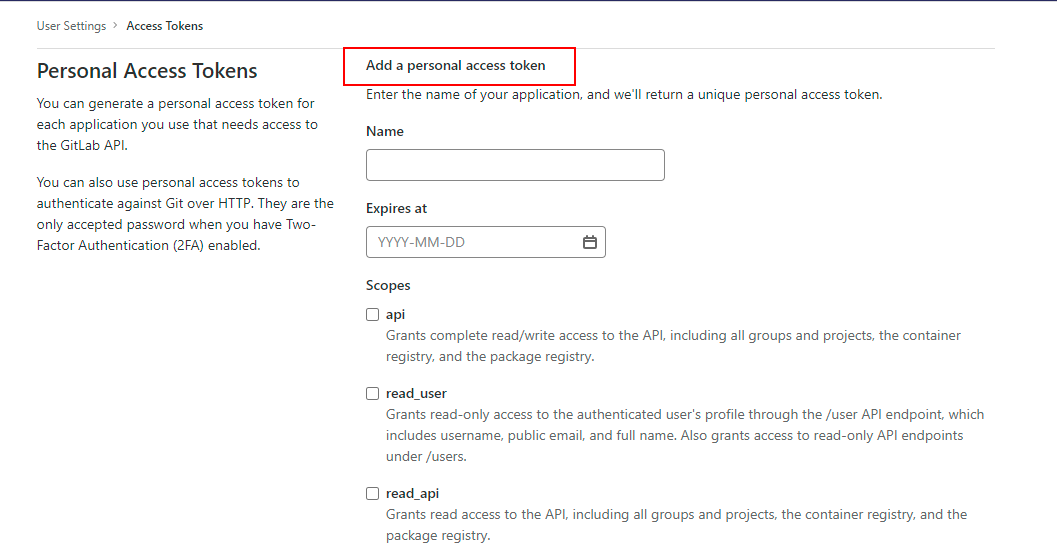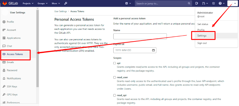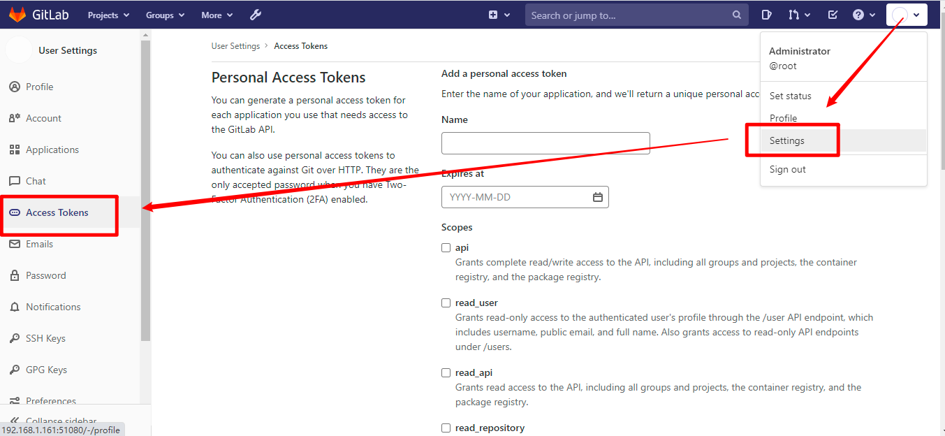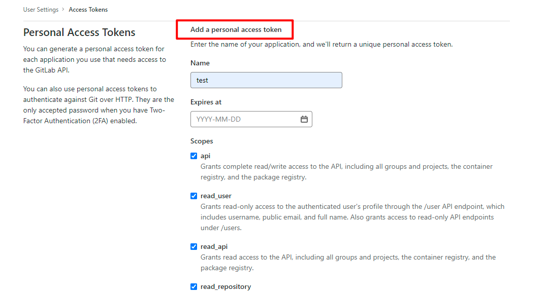 登录GitLab在 Settings 的 Access Tokens 里按页面提示填写,生成Token即可。