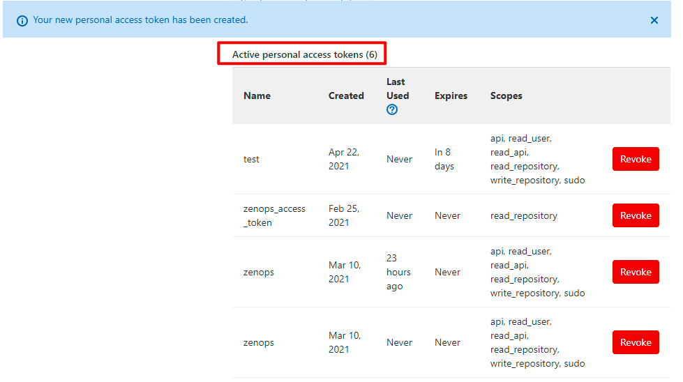 Token 创建成功后,会提示在页面顶部。