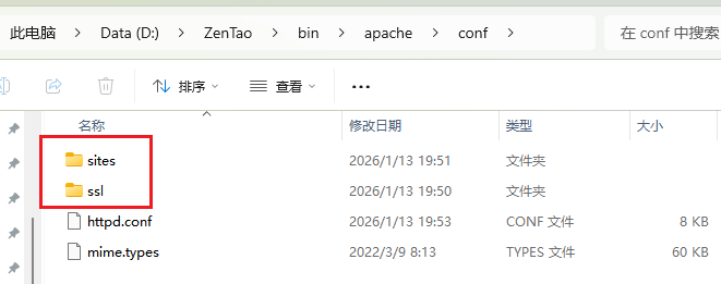 到禅道Windows一键安装包的 D:\ZenTao\bin\apache\conf 目录下创建 sites 和ssl 文件夹。