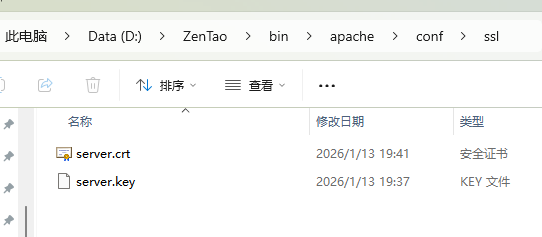 把我们openssl生成的https证书文件放到 D:\ZenTao\bin\apache\conf\ssl 目录下