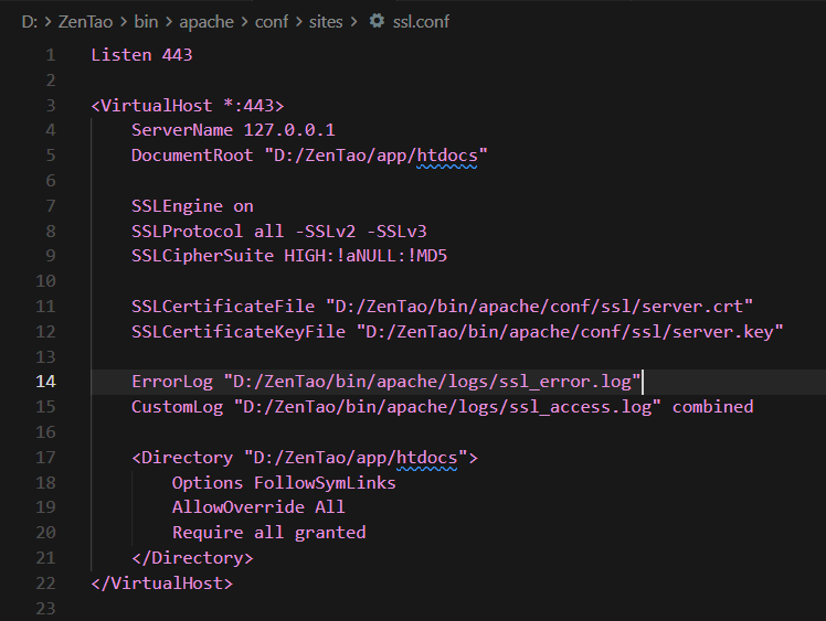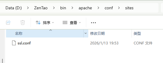在 D:\ZenTao\bin\apache\conf\ssl 目录下添加 ssl.conf 配置文件