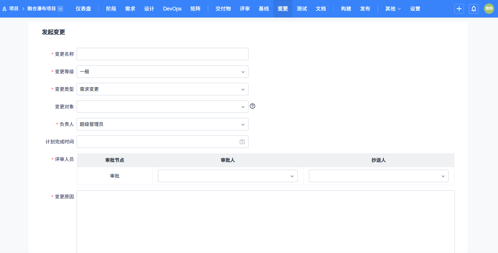 也可以在“评审”--“发起评审”功能选择项目变更类型发起项目变更。