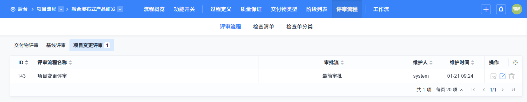 3. 后台-项目流程-评审流程,基线内置项目变更流程,默认为最简审批流程,使用前先检查审批流程是否适用,若不适用,可以修改创新建评审流程。后台评审流程设置使用手册
