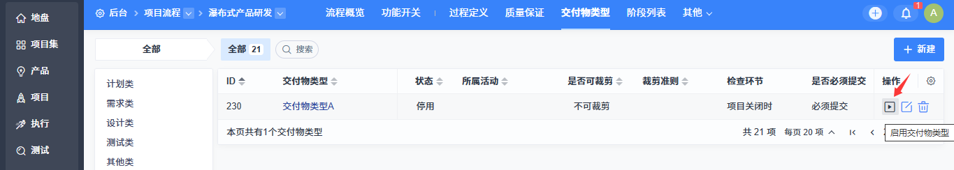 如需停用某个交付物类型,可在交付物类型列表的“操作”栏点击“停用”。停用后,该交付物类型将在基于该项目流程创建的项目中被隐藏。