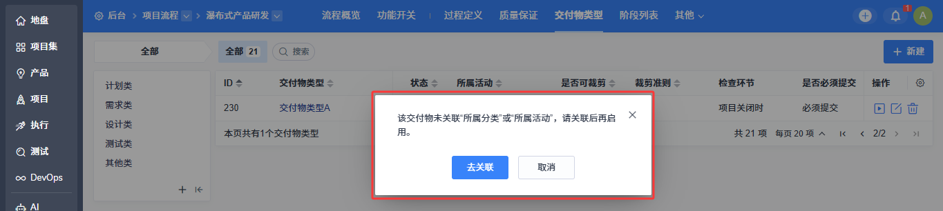 如需启用某个交付物类型,系统会先检查其是否已关联所属分类和所属活动;若未关联,将弹出提示,需完成关联后方可启用。启用后,该交付物类型将在基于该项目流程创建的项目中显示。