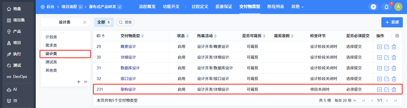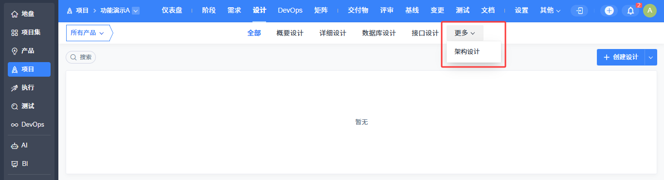 新建设计类交付物类型后,该交付物类型会展示在“项目/设计”的导航中,功能与系统内置的“概要设计”“详细设计”“数据库设计”“接口设计”等交付物类型一致。
