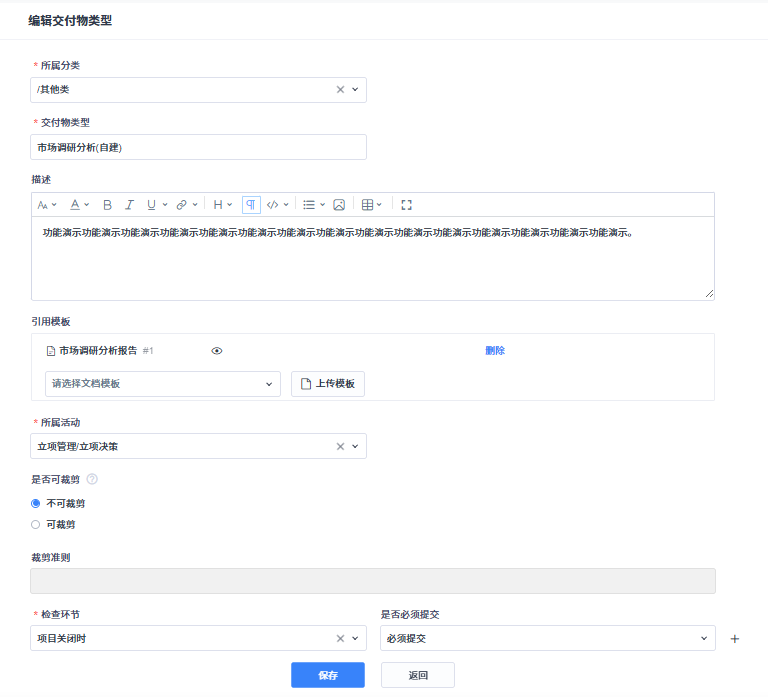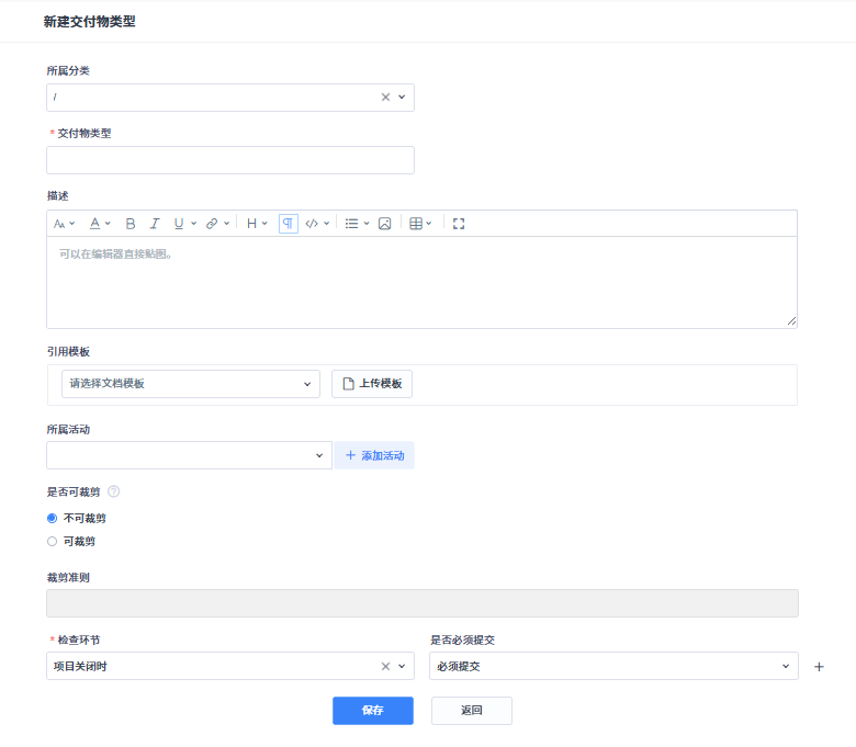 交付物类型可配置检查环节要求,用于在项目和执行关闭时校验该交付物是否需要强制提交;如无严格要求,可设置为“可选择提交”。