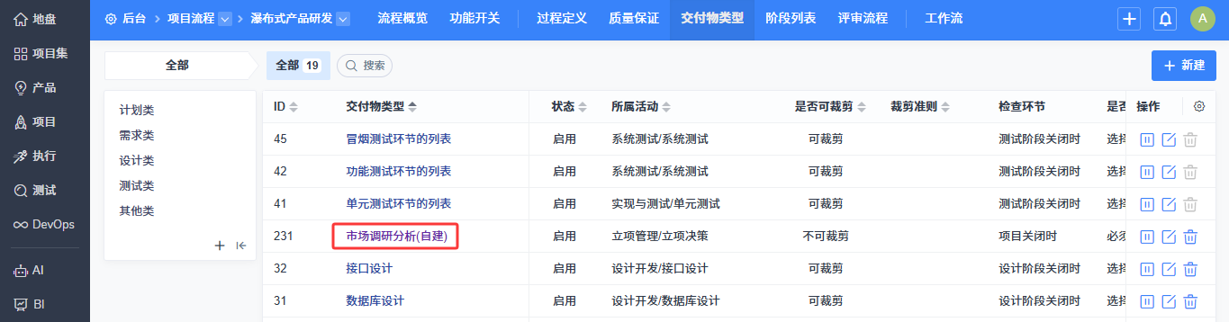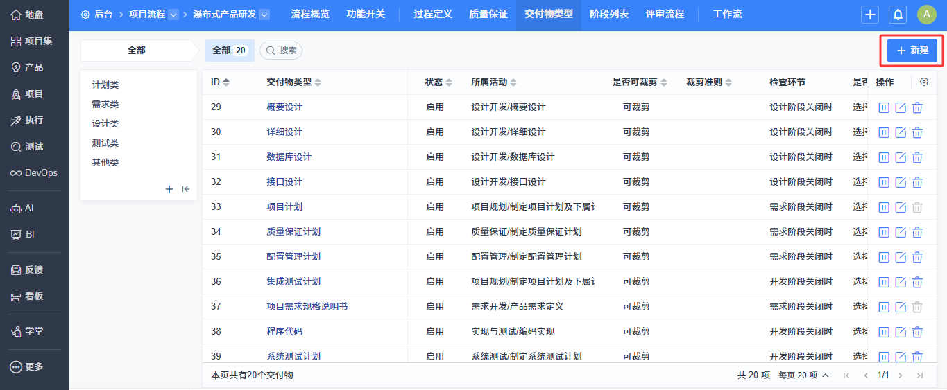 在交付物类型列表中,点击右上角的“新建”按钮,打开新建交付物类型的页面。