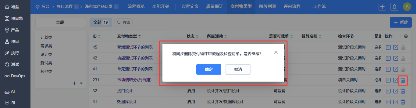 在交付物类型列表中,点击列表操作列中的“删除”按钮,即可删除交付物类型,删除的交付物类型将进入回收站。
