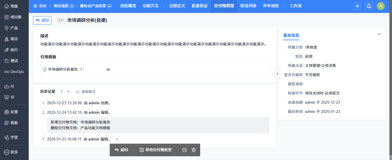 1. 项目流程的规范化管理在组织推行标准化项目流程时,不同类型的项目(如产品开发、客户交付、研究创新)通常对应不同的阶段活动和产出要求。通过交付物类型配置,可以为各类流程定义具体的交付物清单与模板,确保项目执行有据可依、可检可控,避免因人员差异导致的交付内容缺失或标准不一致。