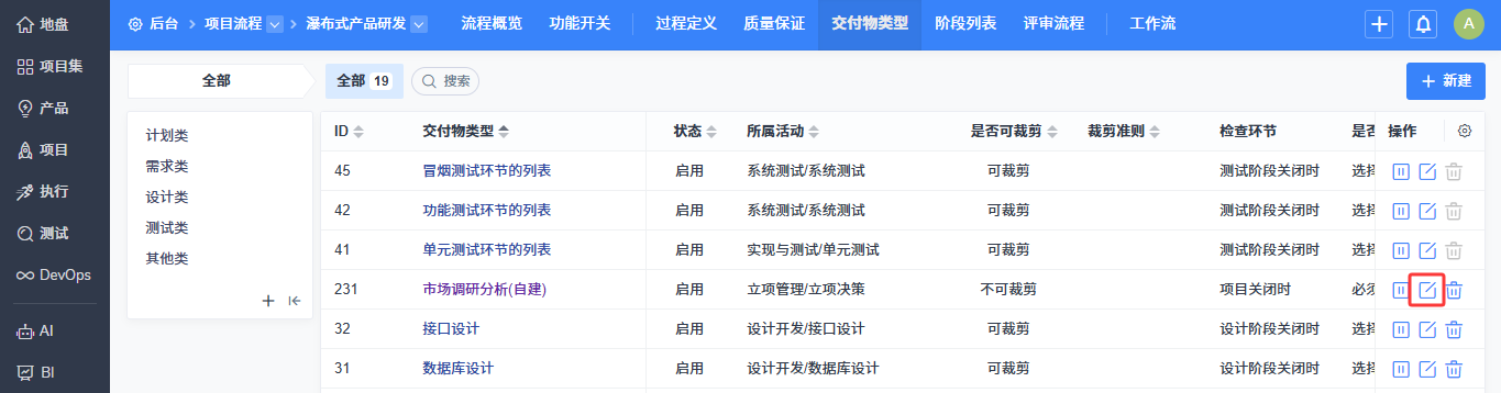 交付物类型在新建并保存成功后将默认处于启用状态,可直接在使用该项目流程的项目中生效。如需停用某个交付物类型,可在交付物类型列表的“操作”栏中点击“停用”。停用后,该交付物类型将在基于该项目流程创建的项目中失效。