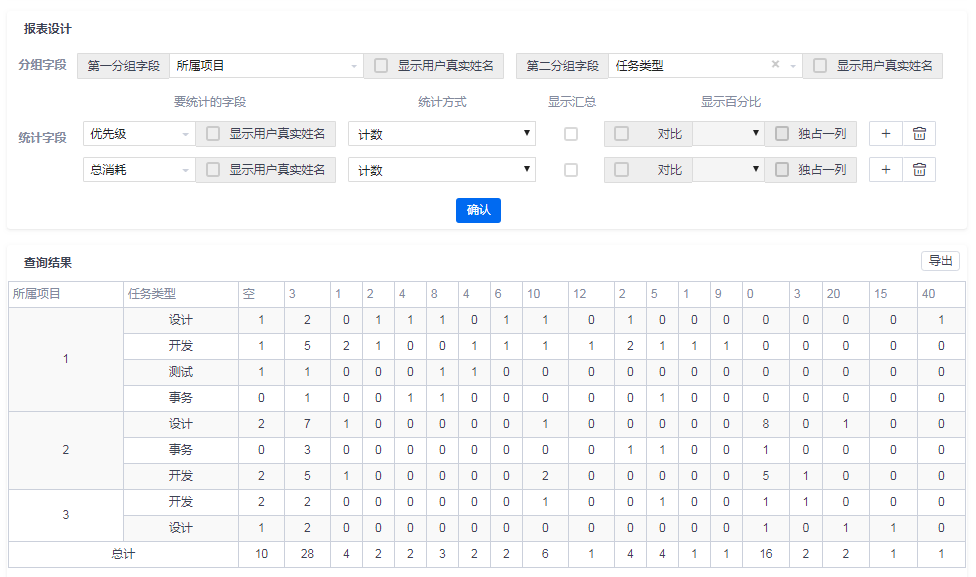 下图的报表条件是根据所属项目的任务类型按照优先级和总消耗统计。