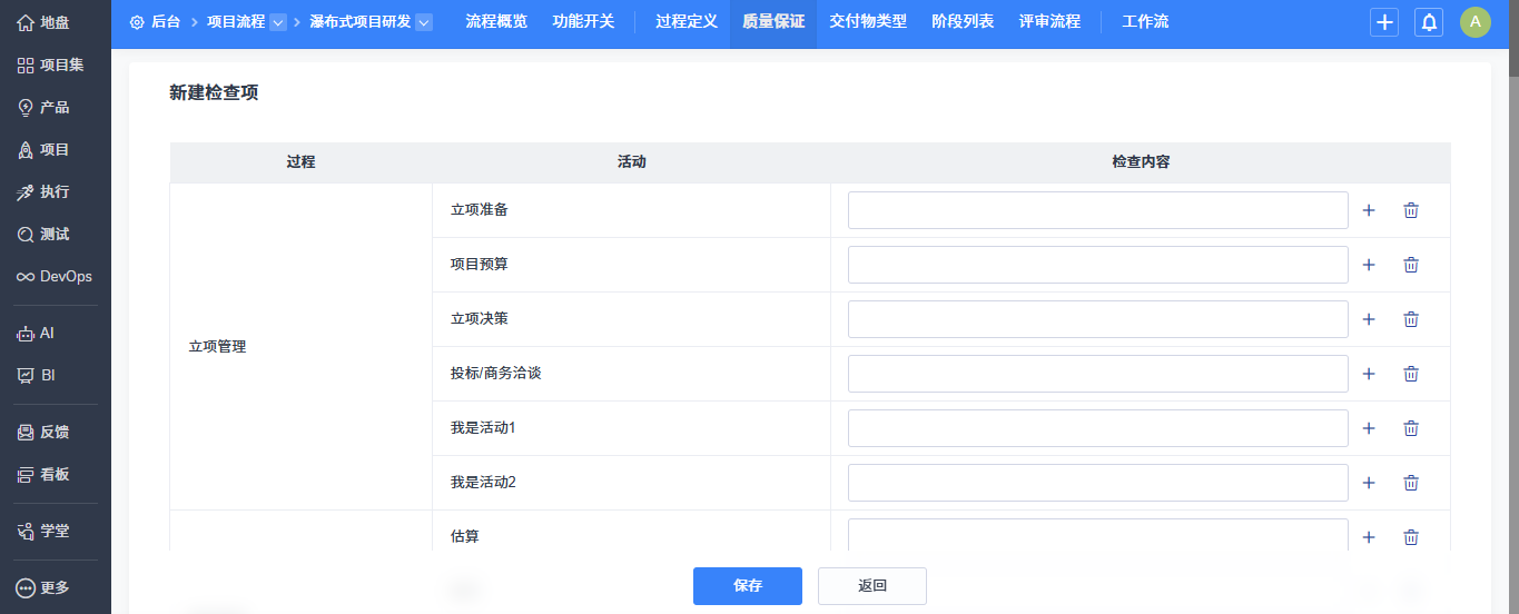 在质量保证检查项列表中,点击右上角的“批量新建”按钮,可进入批量新建页面,为指定活动一次性添加多个检查项。保存成功后,新增的检查项将直接应用于使用该项目流程的项目中。