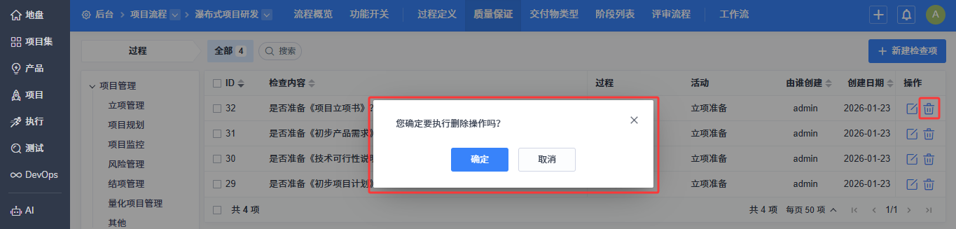 在质量保证检查项列表中,点击操作列中的“删除”按钮,可删除对应的检查项;被删除的检查项将进入回收站。