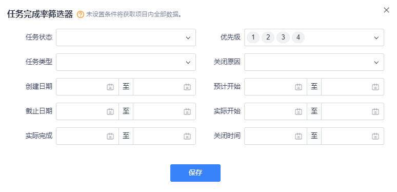 点击插入系统数据区块-图表tab下的各图表,显示对应图表的筛选器弹窗。其中项目-基本统计、执行-基本统计,不会显示筛选器弹窗,会直接在报告编辑器中插入图表。(不同列表的筛选条件不同)