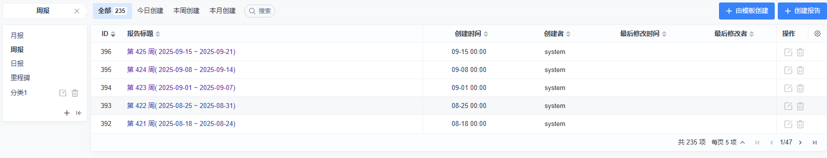 21.7.6系列(旗舰版7.5、IPD版4.5)之前的版本升级后,原项目-报告-报告下的周报会升级到项目-报告下报告列表的周报分类下,名称为:第X周(年-月-日~年-月-日)。升级后的周报数据,编辑和删除按钮置灰,提示:历史报告数据不允许编辑/删除。