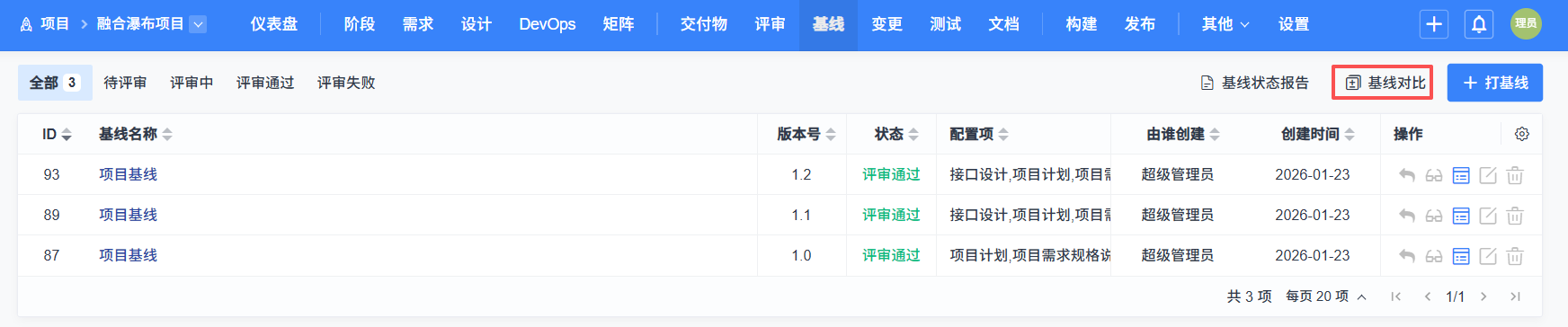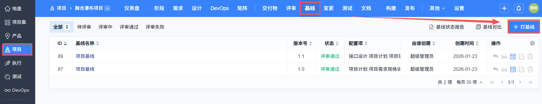 点击项目的“基线”--“打基线”功能可以对评审通过/已确认的且未在评审后修改过的交付物打基线。