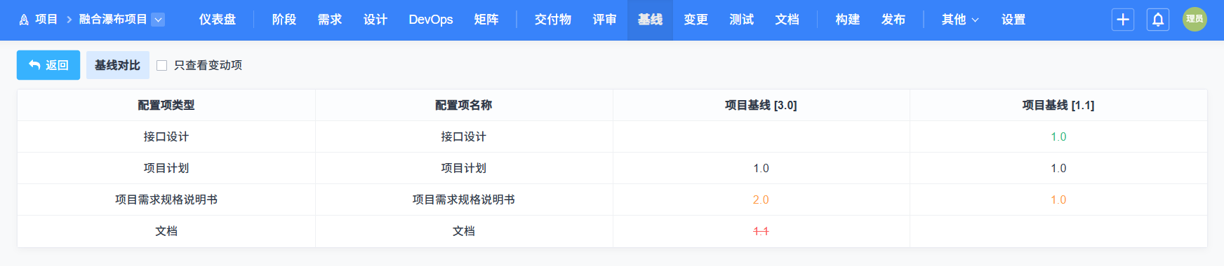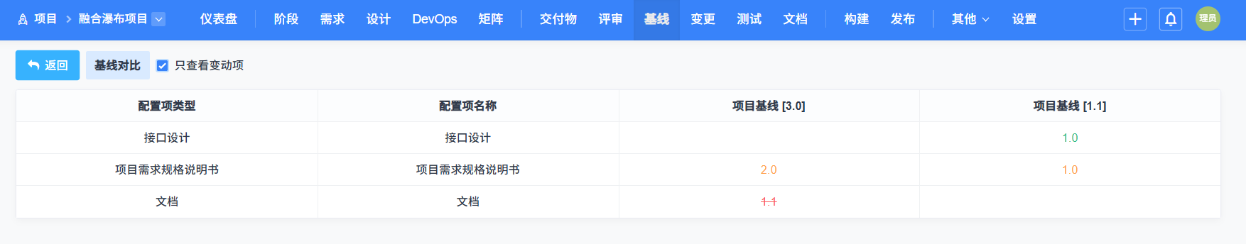 橙色代表两个基线下都有这个交付物,但是交付物版本不同。