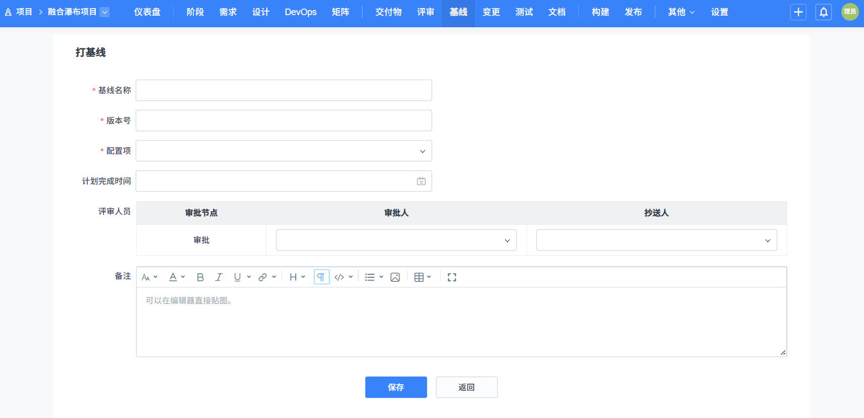 点击保存,评审中和评审成功的交付物将会冻结,不允许编辑删除,如果评审失败,交付物会解冻,交付物可以修改,修改后评审通过可以重新打基线。