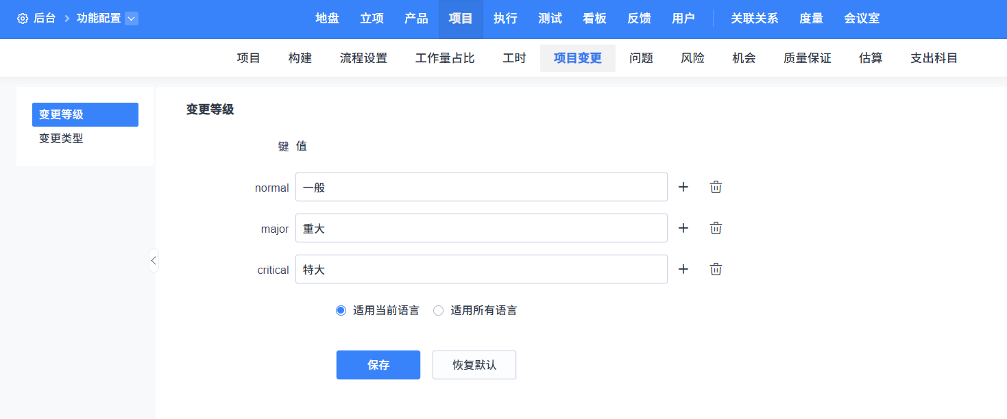 项目变更的变更等级和变更类型可以在“后台”-“功能配置”-“项目”-“项目变更”下自定义。