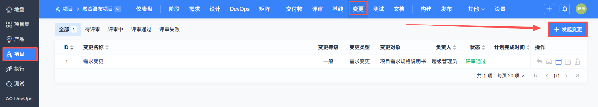 点击项目的“项目变更”--“发起变更”功能可以发起项目变更。