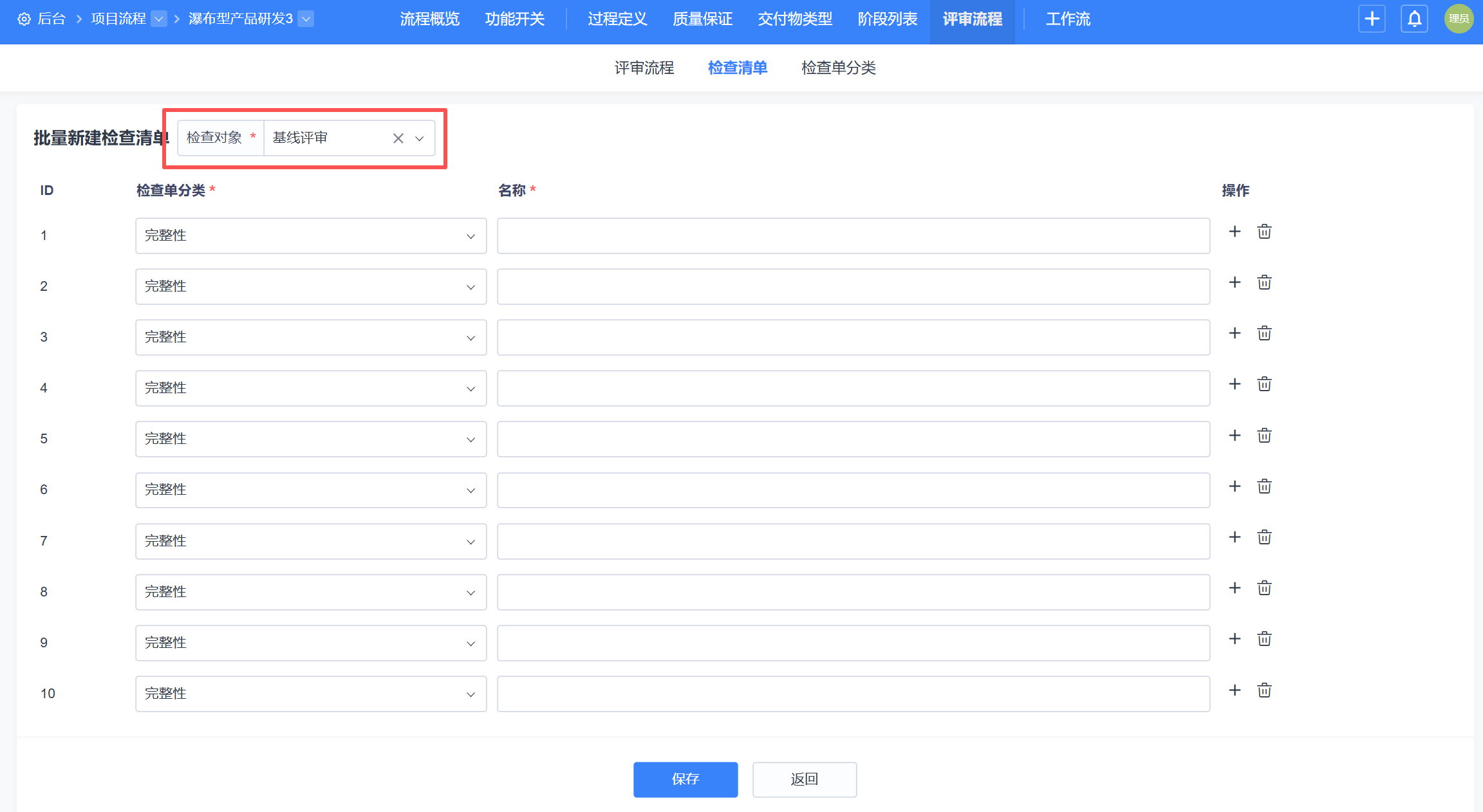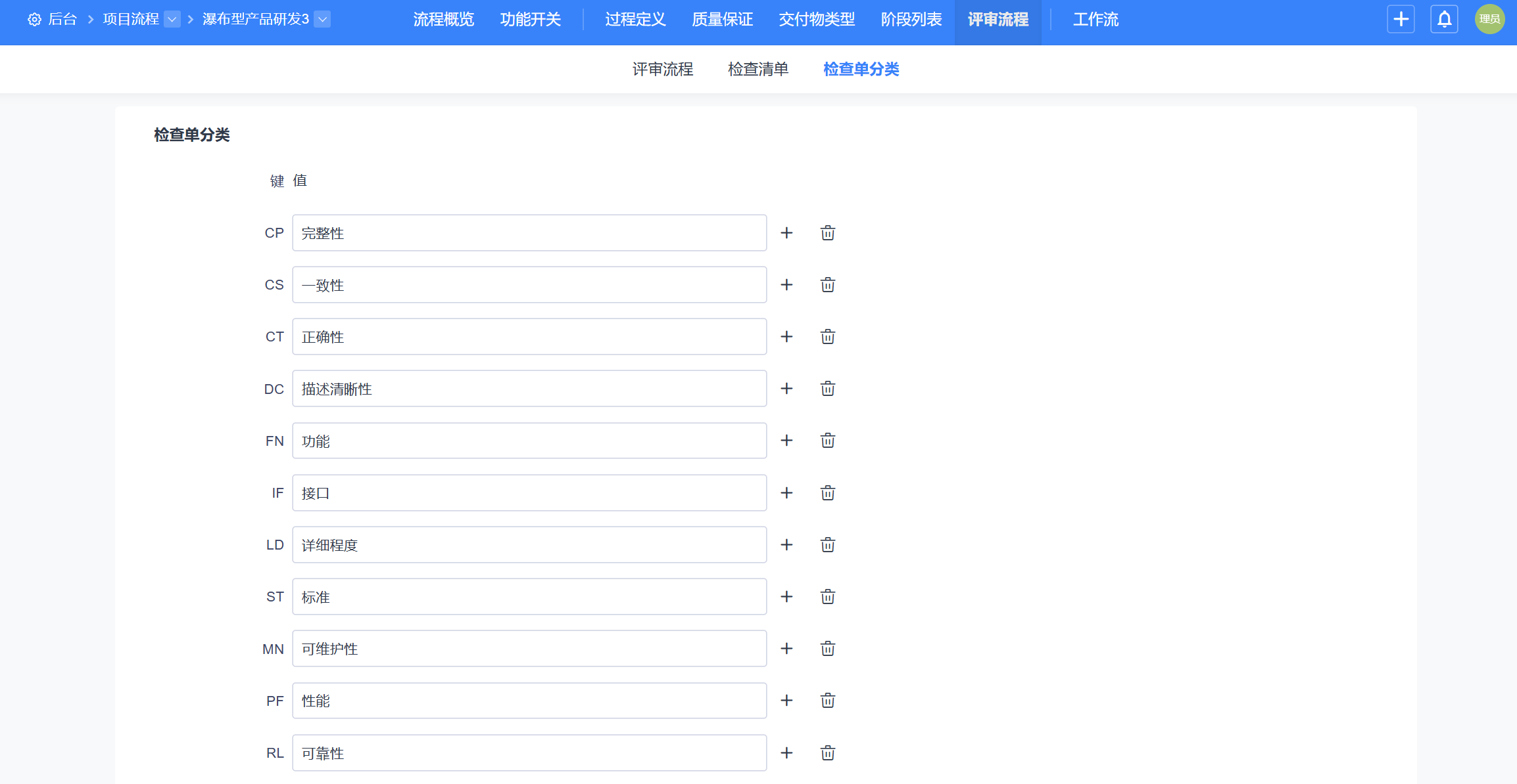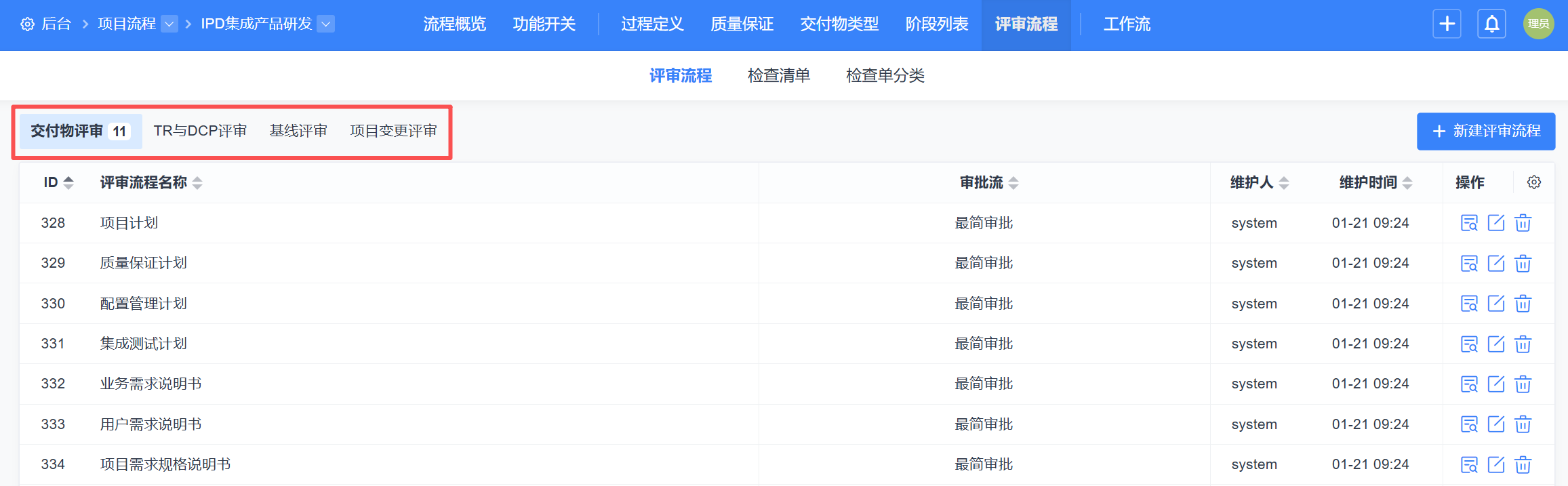 您可以在此处为交付物评审、TR与DCP评审(IPD版)、基线评审、变更评审分别配置评审流程、检查清单及检查单分类。