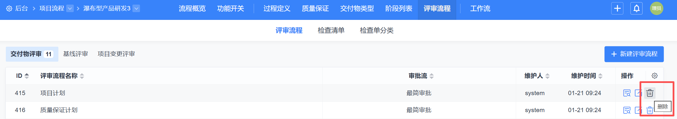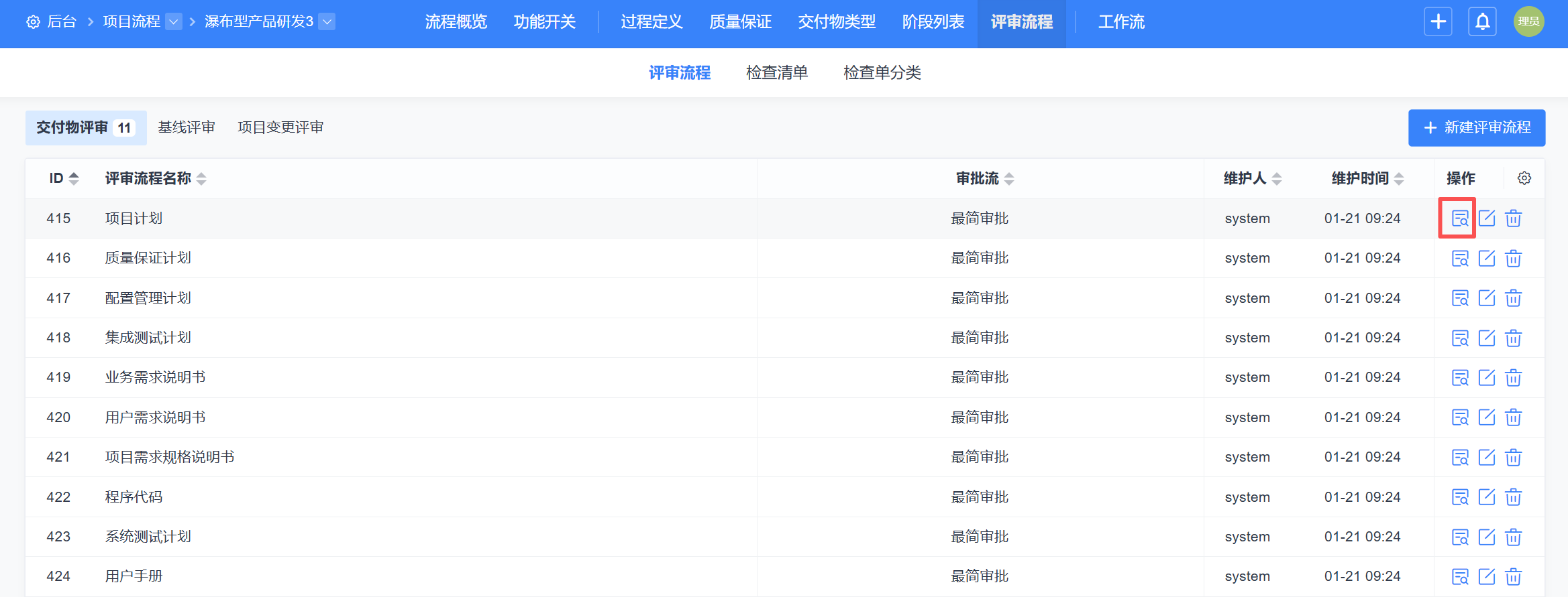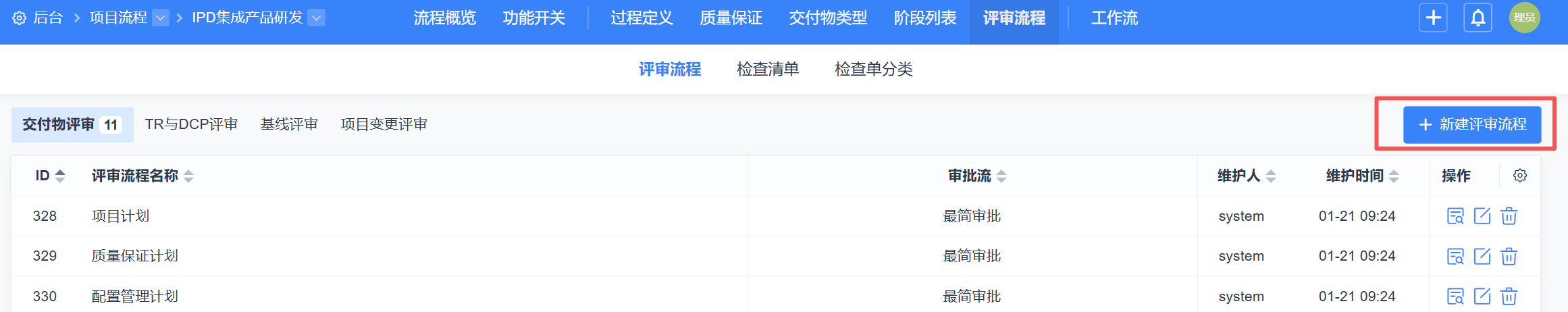 只有交付物需要创建评审流程,其他对象均已内置好,直接编辑即可。