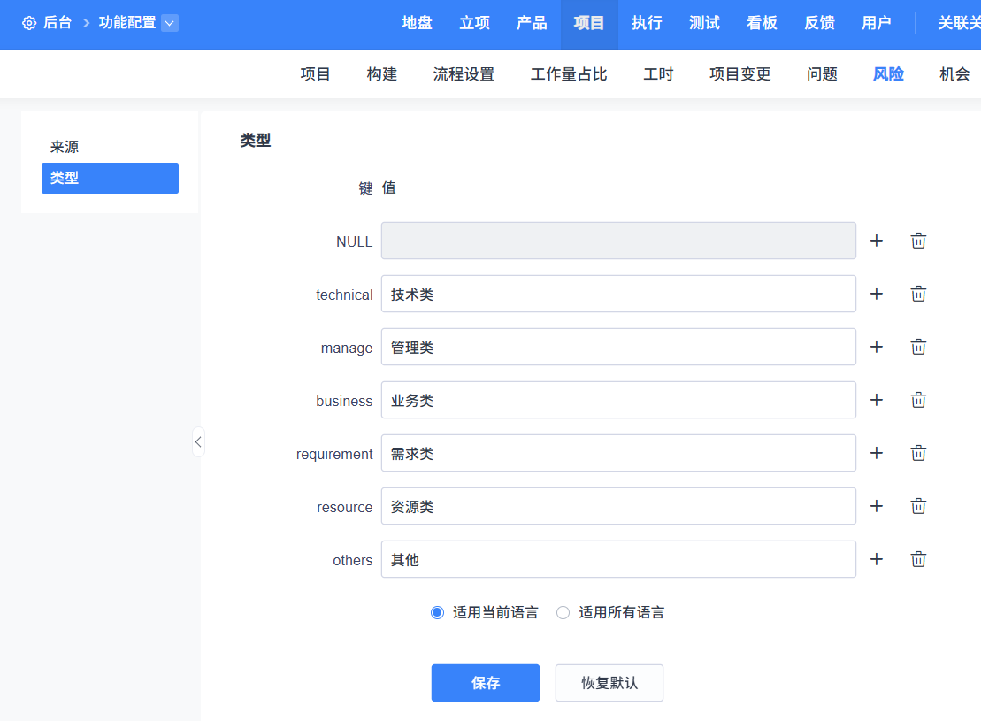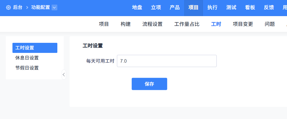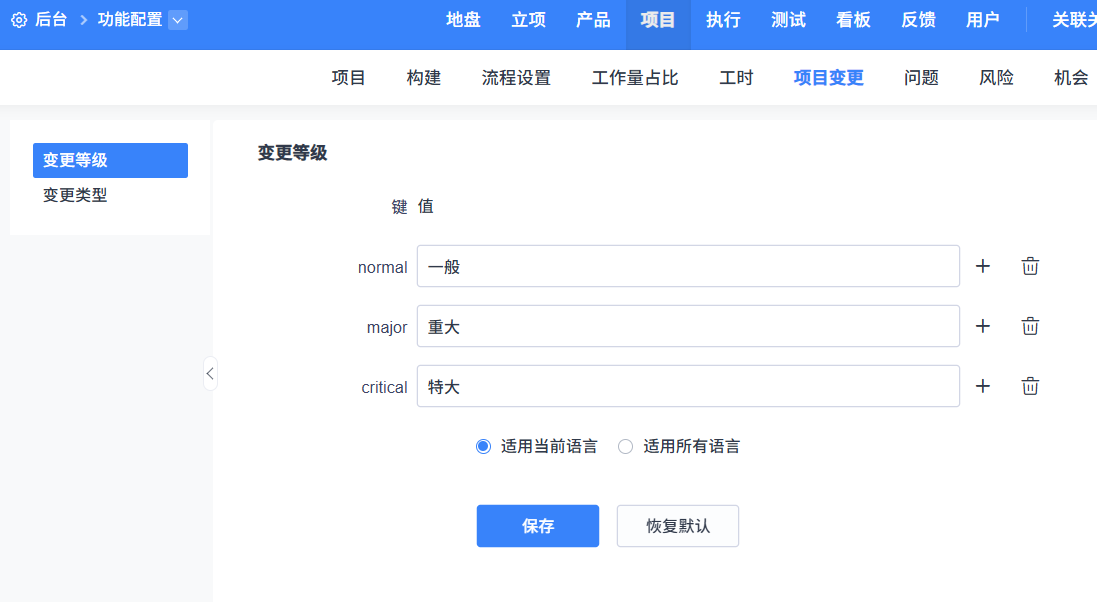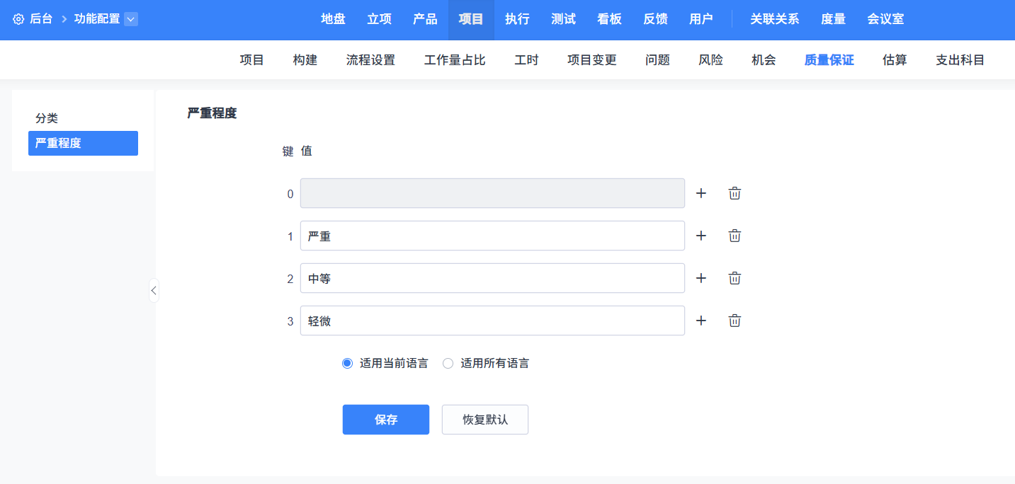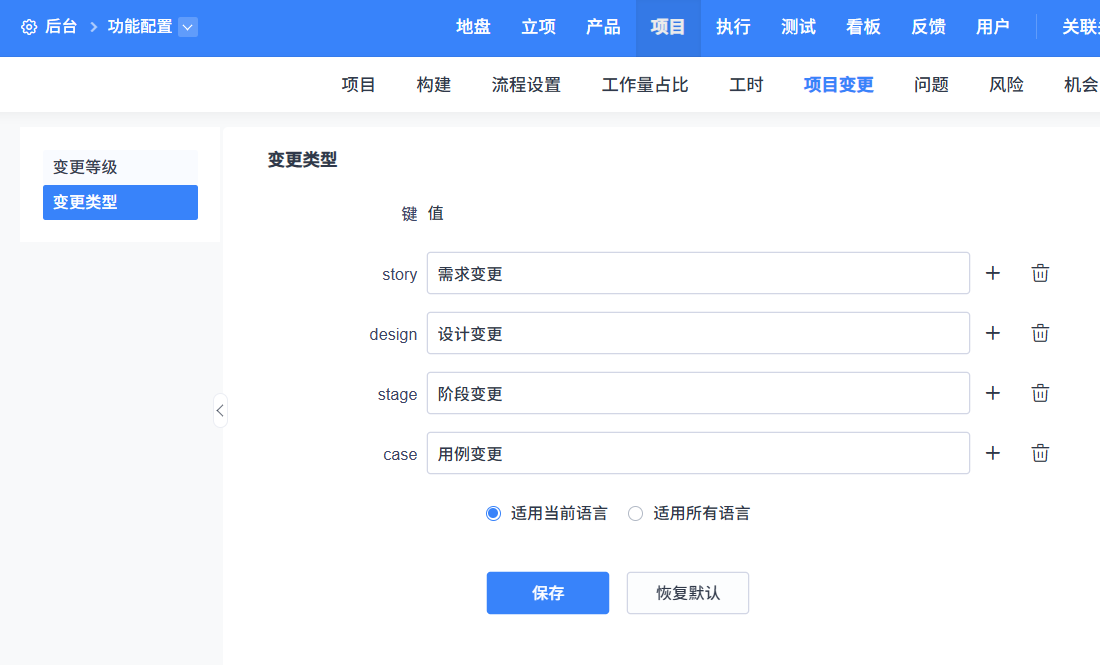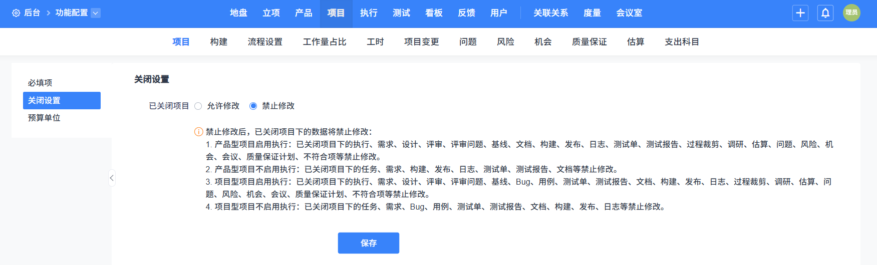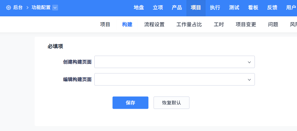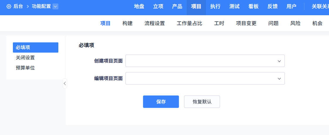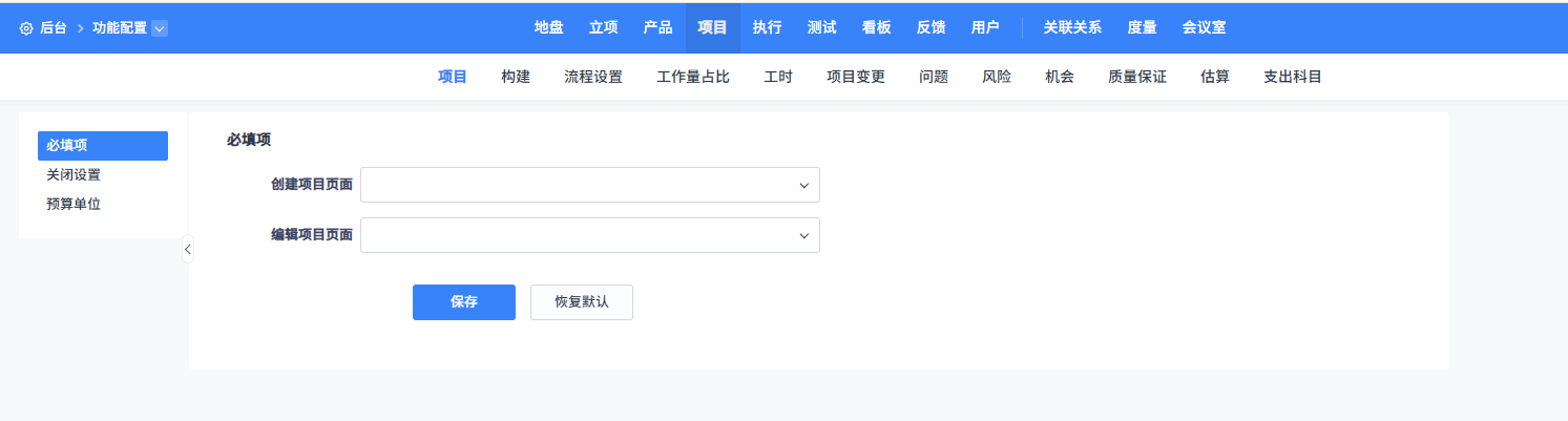 在“后台”-“功能配置”-“项目”中配置项目通用要素的配置项,比如项目、构建、流程设置、工作量占比、工时、项目变更、问题、风险、机会、质量保证、估算、支出科目等。