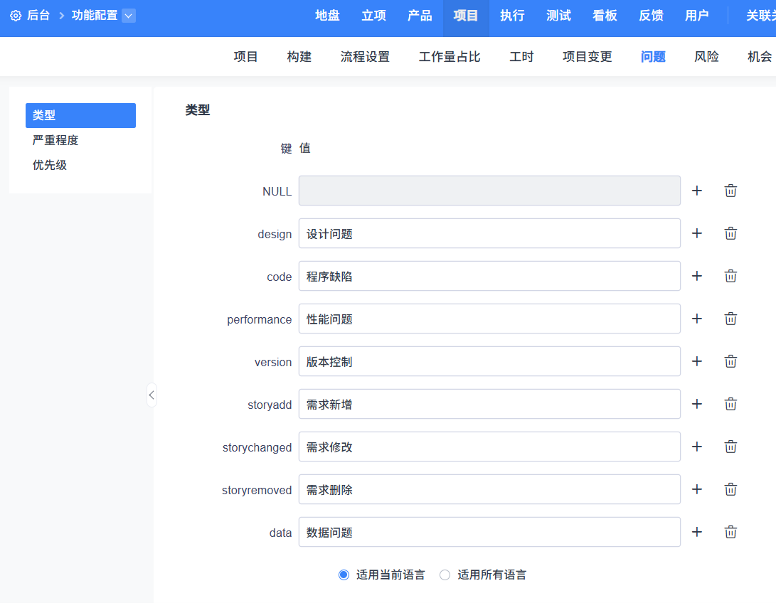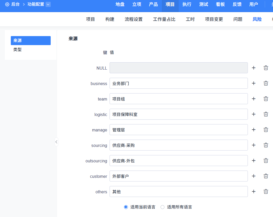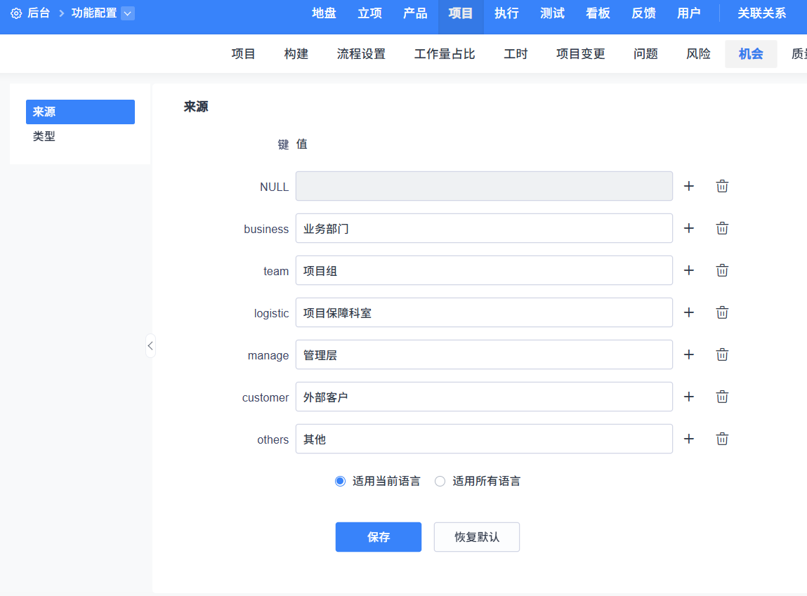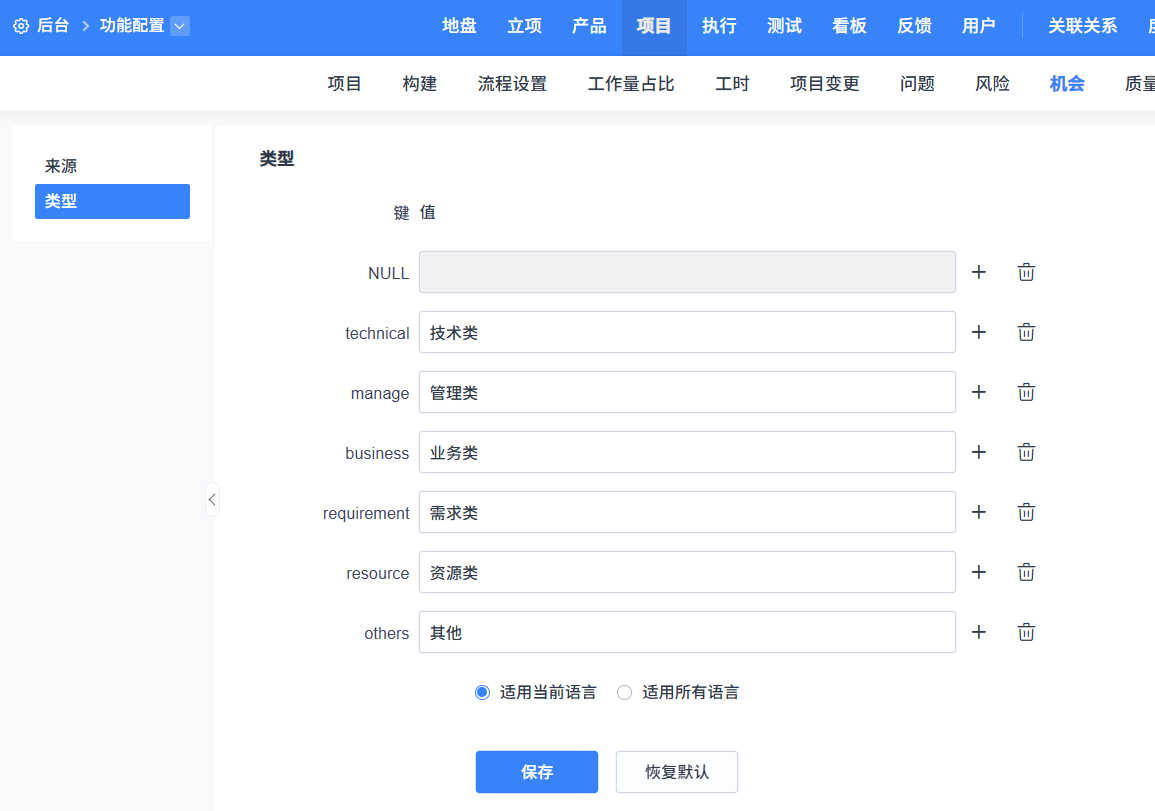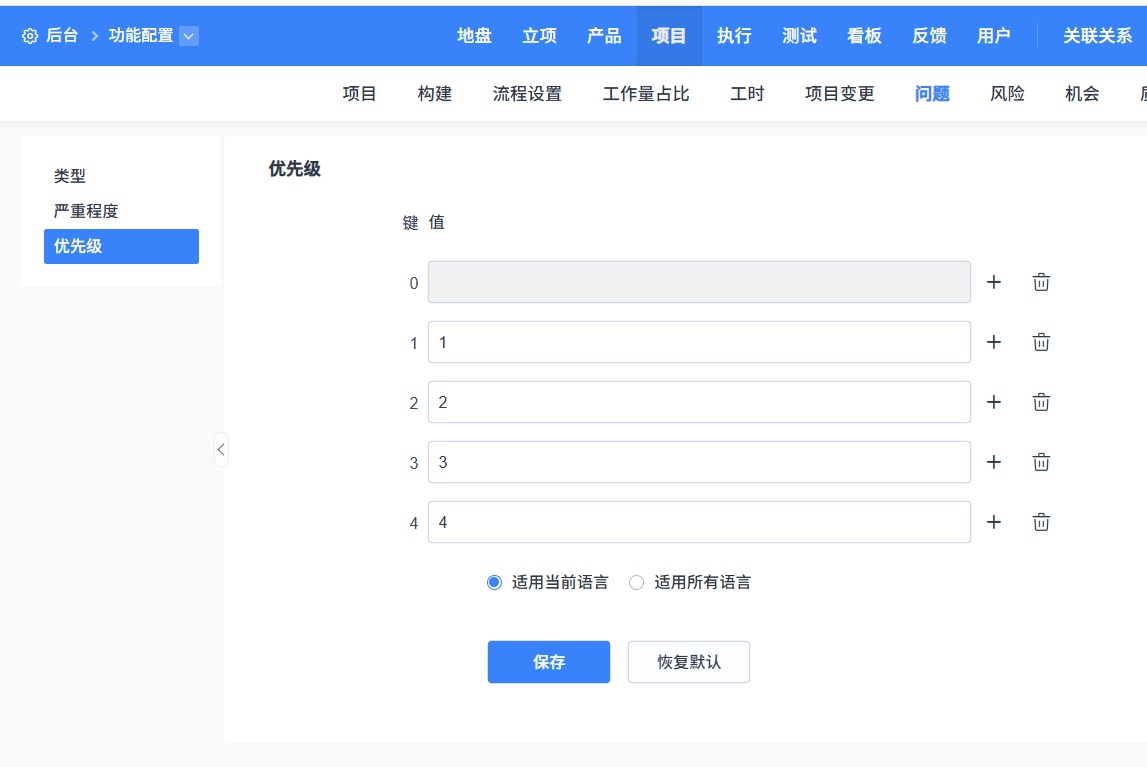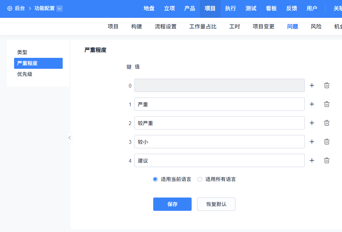 在“后台”-“功能配置”-“项目”中配置项目通用要素的配置项,比如项目、构建、流程设置、工作量占比、工时、项目变更、问题、风险、机会、质量保证、估算、支出科目等。