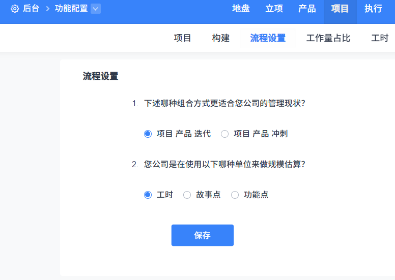 在流程设置中设置项目、产品、迭代的管理方式和规模估算单位。