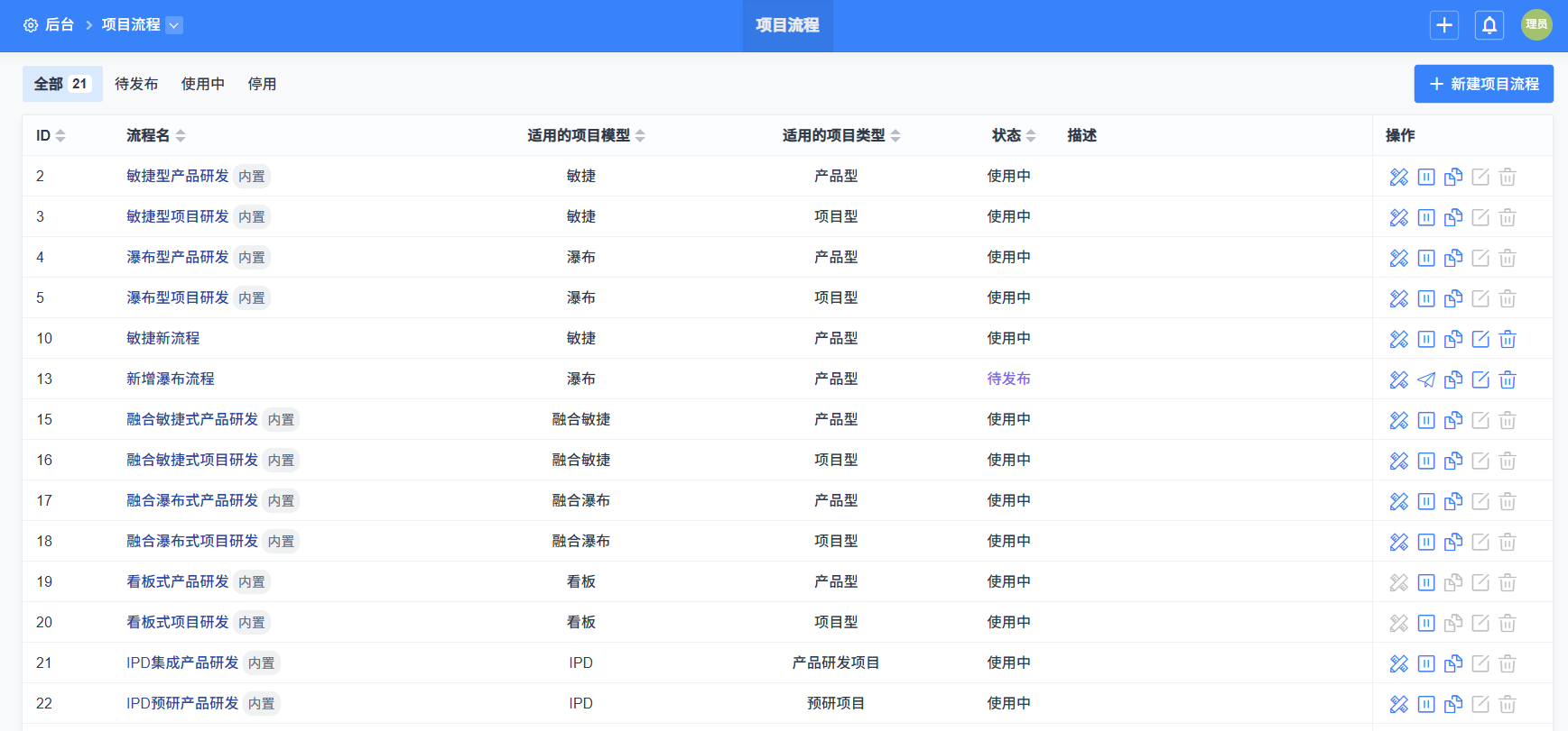 - 项目流程需要额外维护“适用的项目模型”和“适用的项目类型”。创建后不可再编辑。