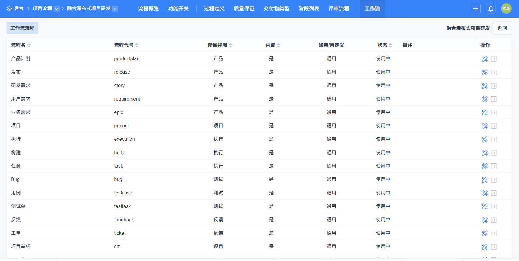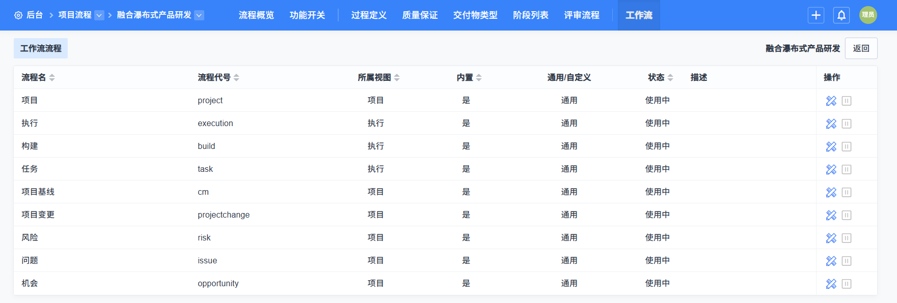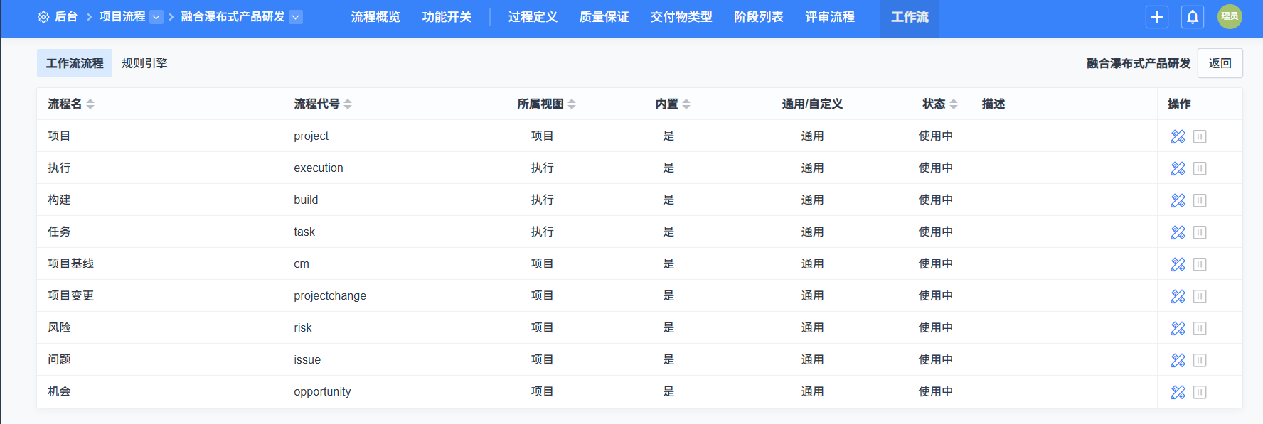 - 项目流程中的内置流程不支持停用。