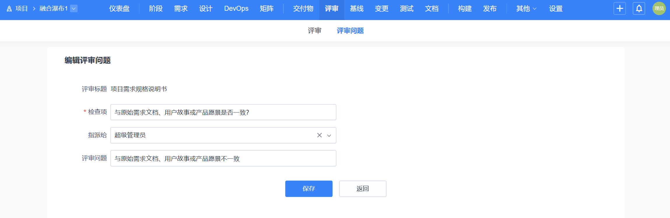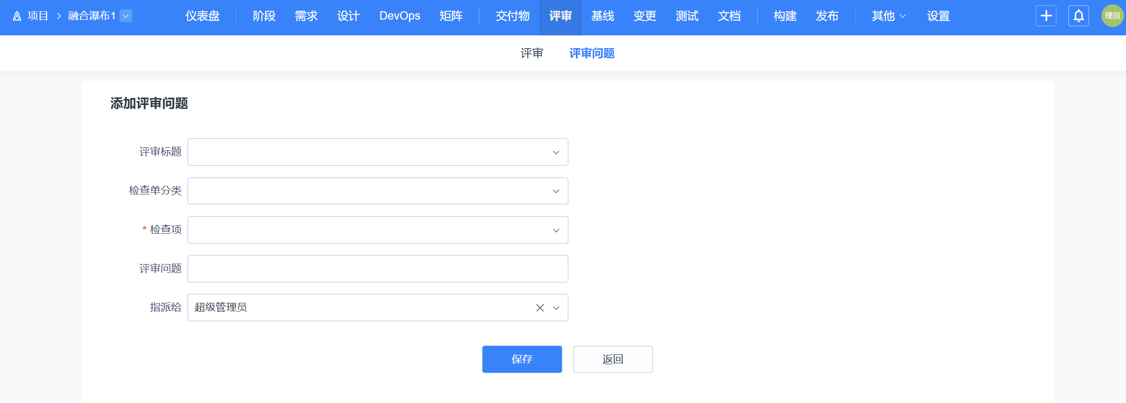 点击【添加评审问题】按钮,可以提交评审问题。只有评审失败的对象才能在这里补充提交评审问题,正常流程需要在评审过程中提交。