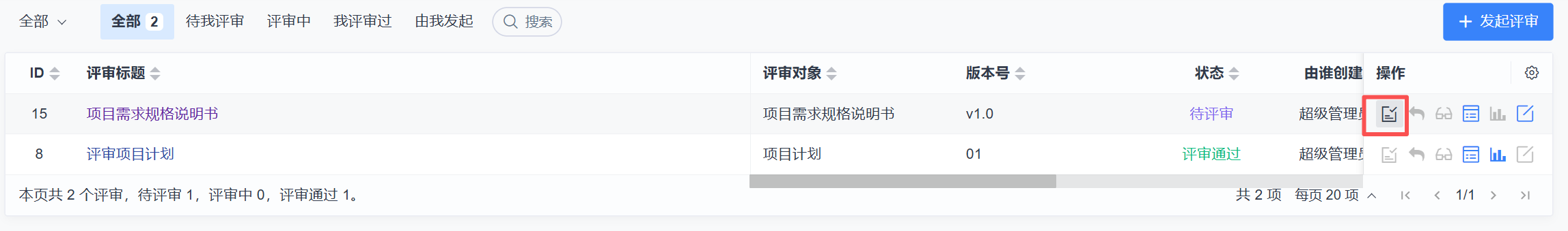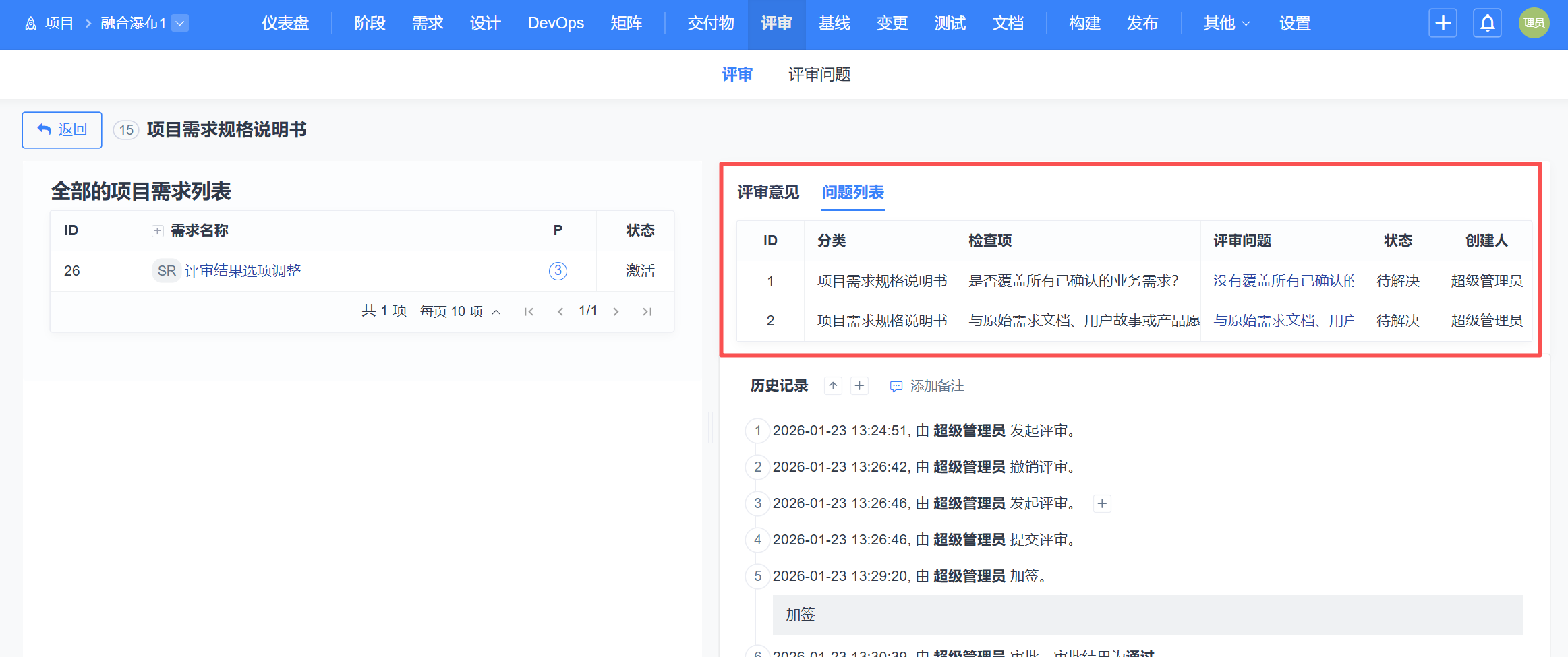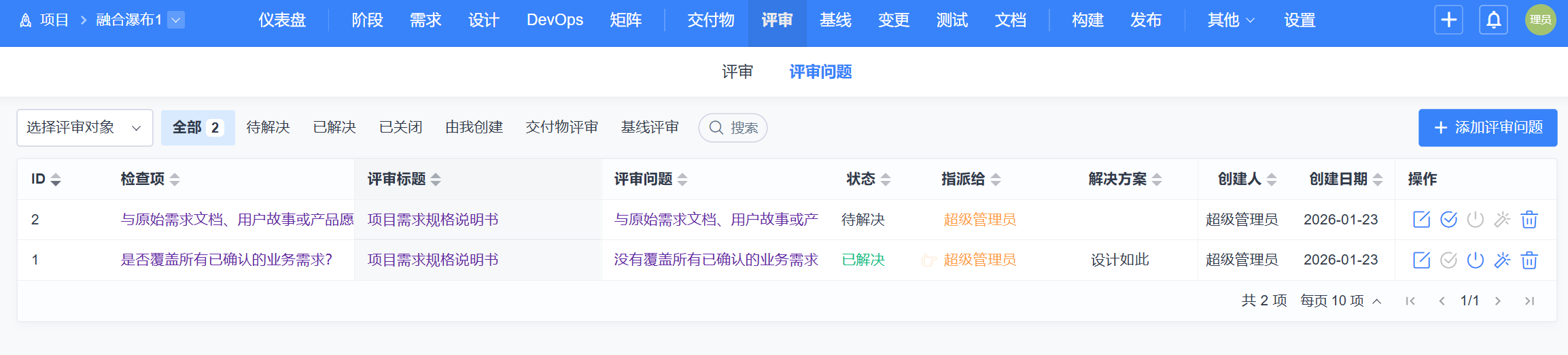 点击【评审问题】,可以查看评审过程中提出的所有问题,跟进问题的解决进度、状态,也可以在这里编辑或删除。