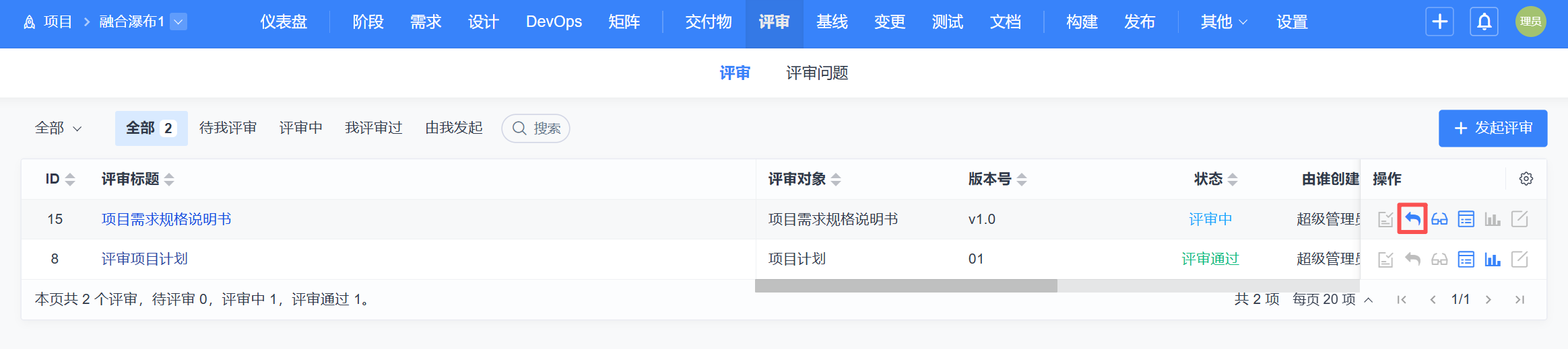 评审功能下支持发起交付物评审、基线评审、项目变更评审、TR与DCP评审(IPD版)。