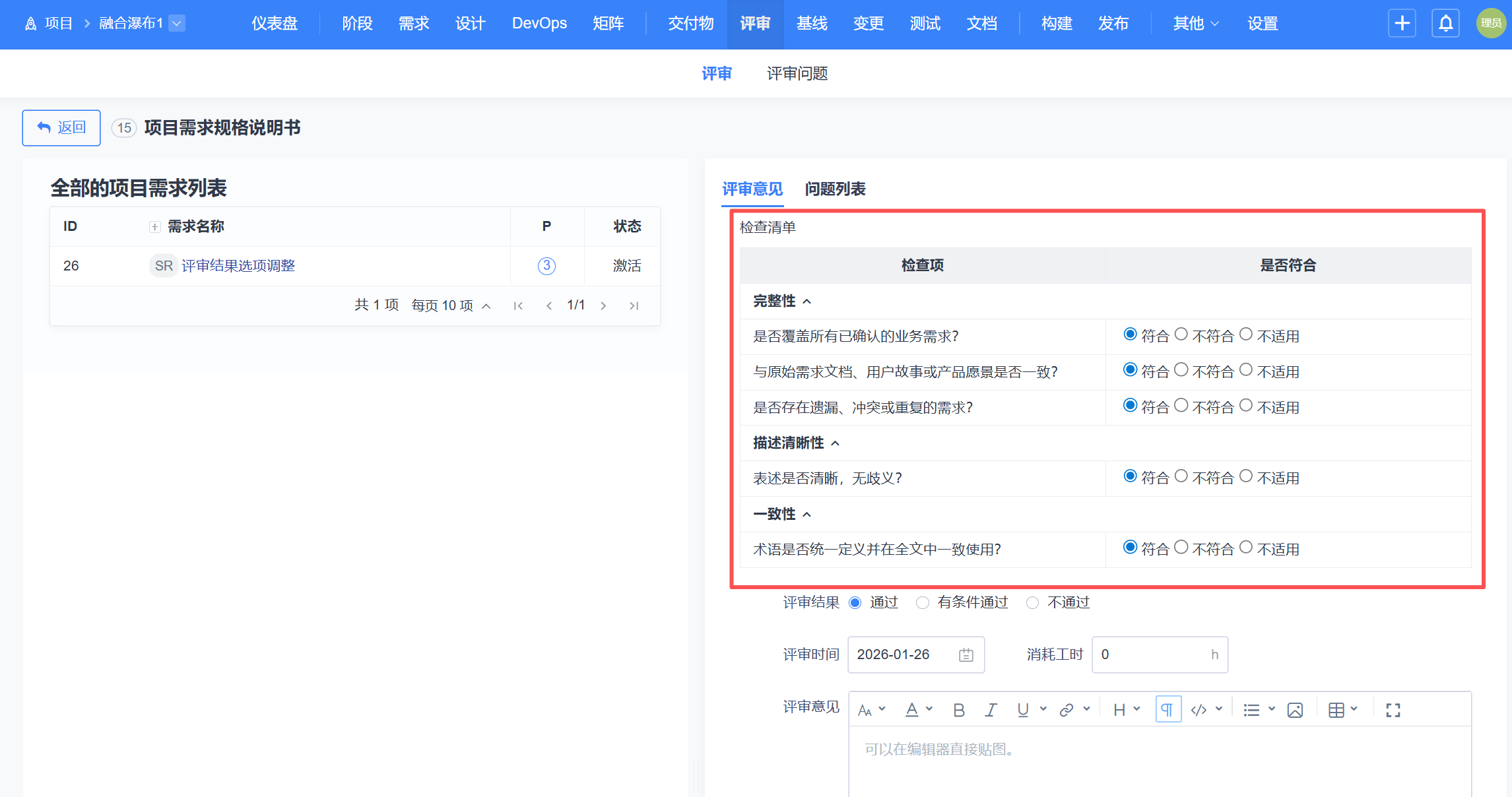 评审人点击【评审】按钮,打开评审页面。左侧展示待评审的内容,右侧展示评审检查项、评审意见和问题列表。